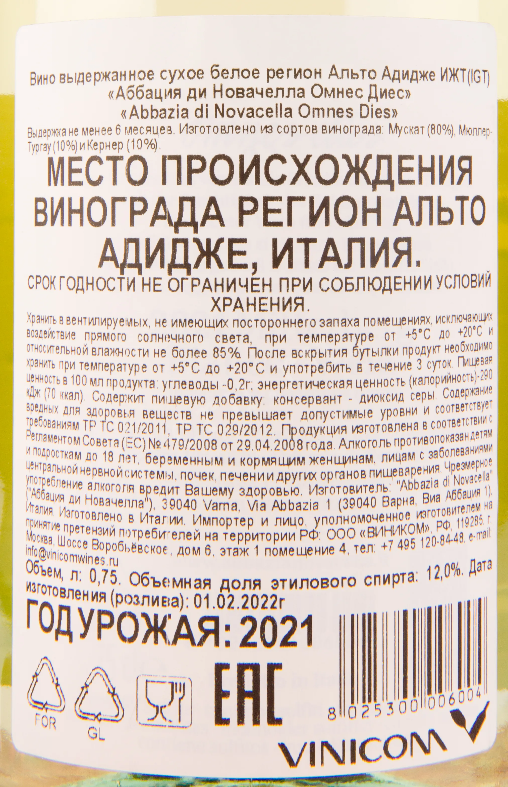 Белое сухое вино Omnes Dies Abbazia di Novacella 0,75 л представляет собой эксклюзивный купаж из 3 европейских сортов, которые были выращены на виноградниках Альто Адидже. Сырье получают с собственных угодий аббатства Новачелла, имеющих южную экспозицию и разбитых на высоте более 600 м на склонах холмов. Прохладный климат и богатые минералами почвы обуславливают особую органолептику сырья. Виноград поспевает медленно и гармонично, его сбор начинается не раньше середины сентября. Ферментация протекает в открытых стальных чанах, благодаря доступу кислорода вино сохраняет свежесть. Оно выдерживается около полугода в стали.