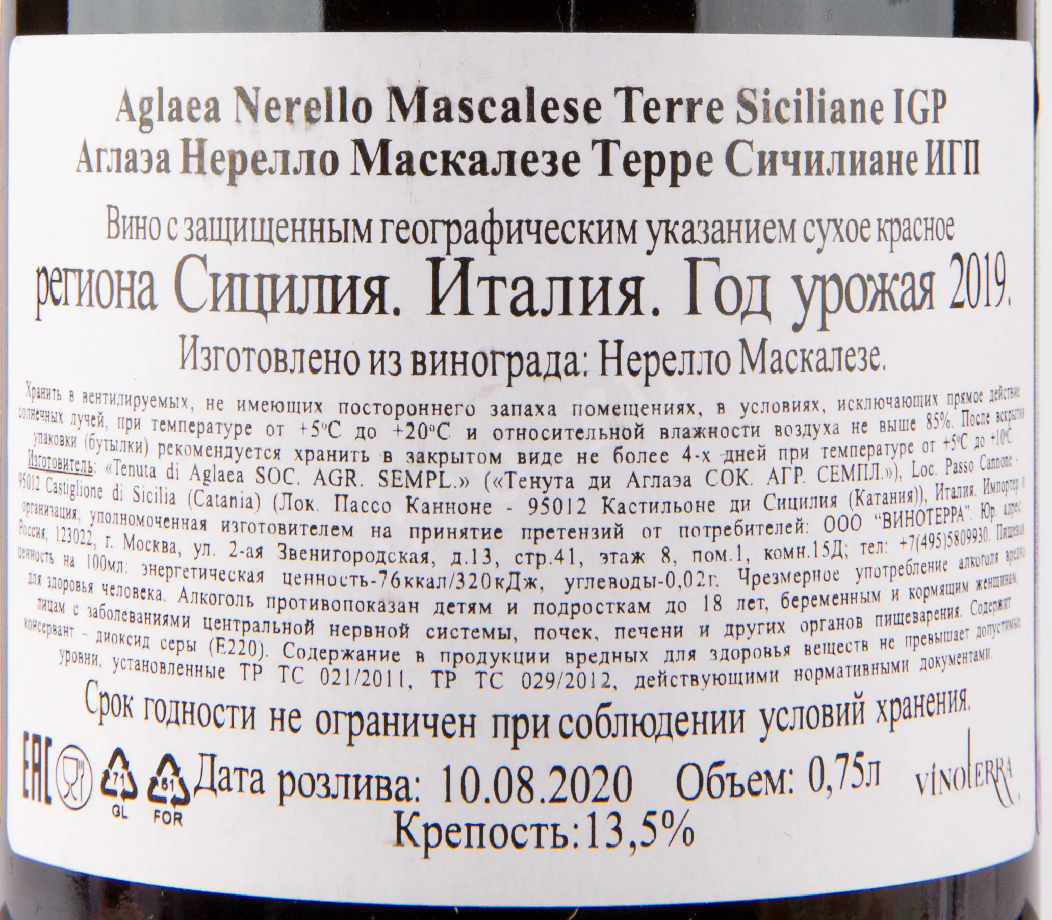 - Сорт винограда: Нерелло Маскалезе 100%.