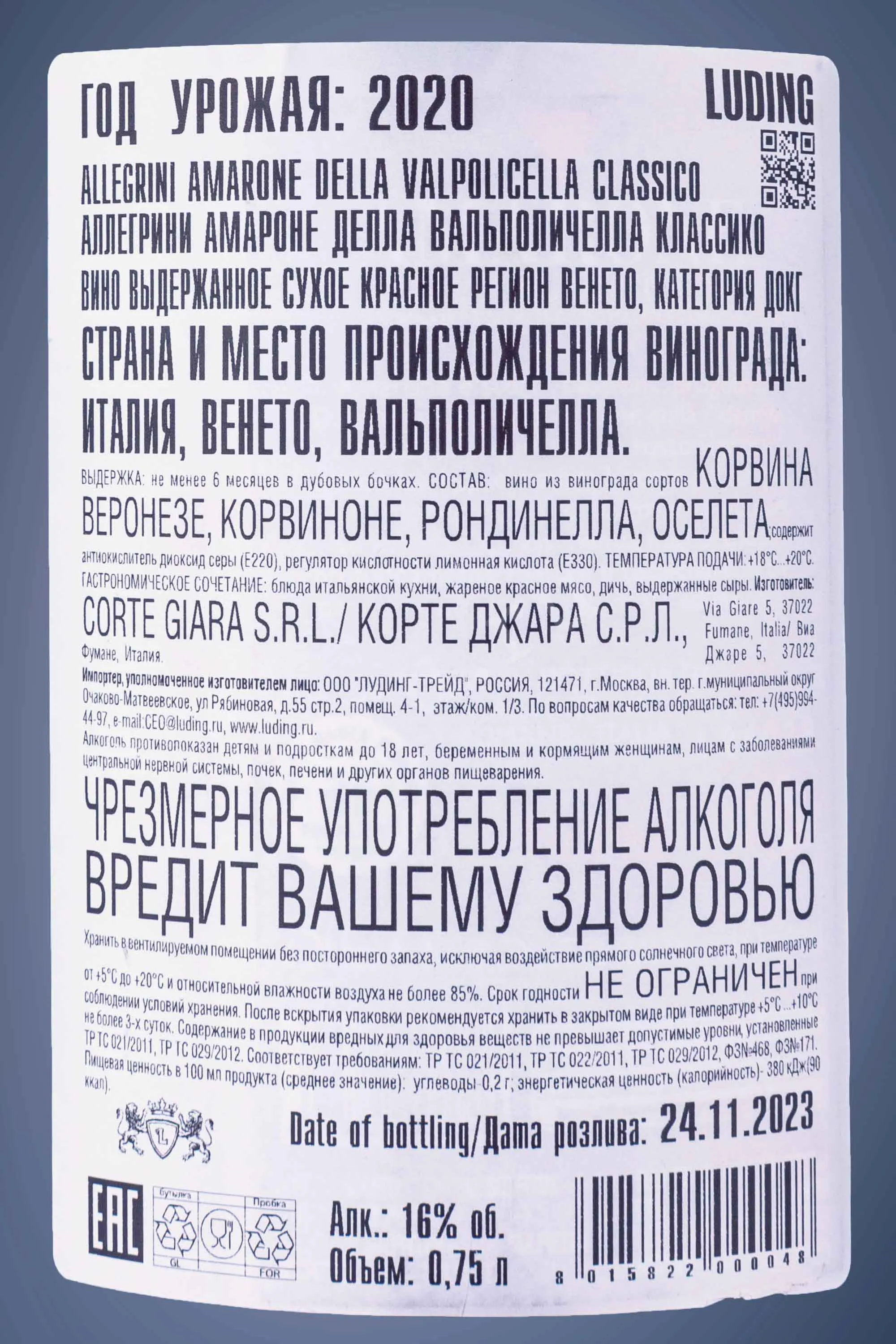 Allegrini Amarone della Valpolicella Classico 2020 0.75 л купить - Итальянское вино Аллегрини Амароне делла Вальполичелла Классико цена в магазинег. Москва, ул. Профсоюзная, д. 16/1010:00-22:00 Ежедневно+7 (495) 920-20-02info@cru.ru