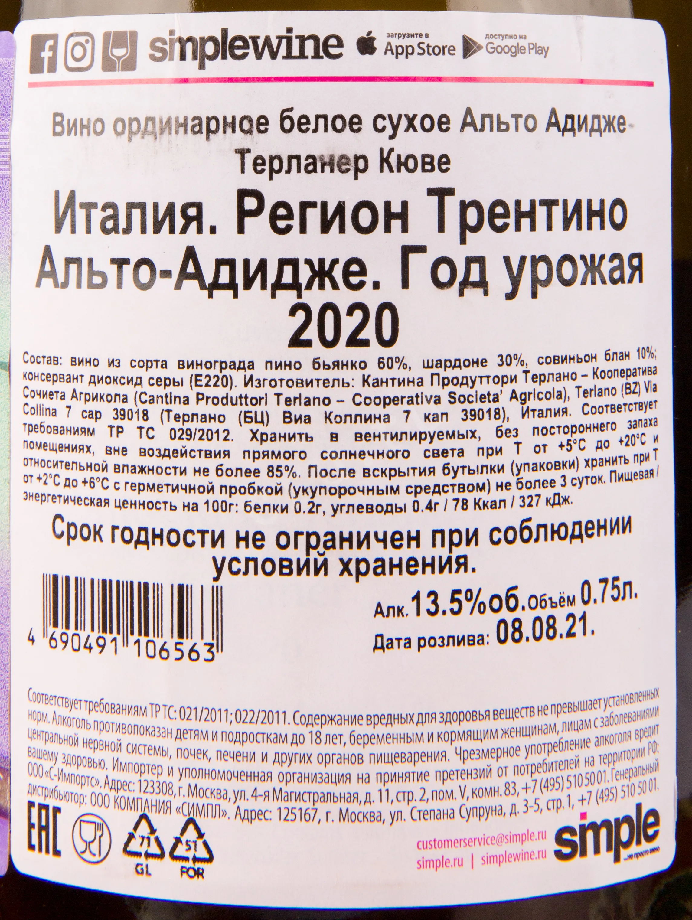 Вино Alto Adige Terlaner Cuvee 2020 0.75 л — элегантный купаж трёх белых сортов винограда: Пино Бьянко, Шардоне и Совиньон Блан. Особенностью производства является бережный ручной сбор урожая и винификация в стальных ёмкостях с частичной выдержкой на тонком осадке, что подчёркивает утончённость и минеральность напитка. Урожай собирается на холмистых террасах Южного Тироля, где альпийский климат и богатые минералами вулканические почвы создают идеальные условия для медленного созревания ягод, наделяя купаж уникальной свежестью и сбалансированной кислотностью.