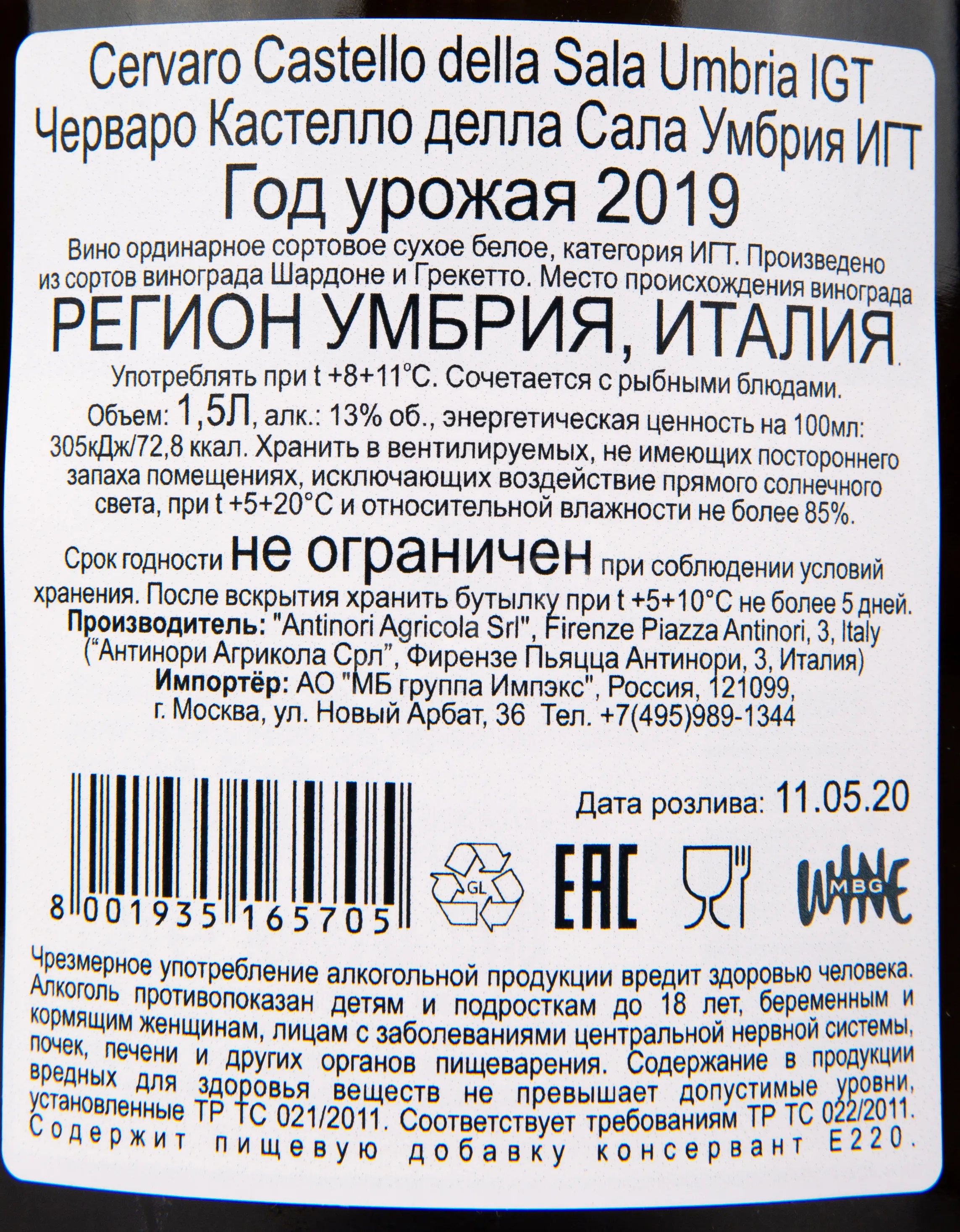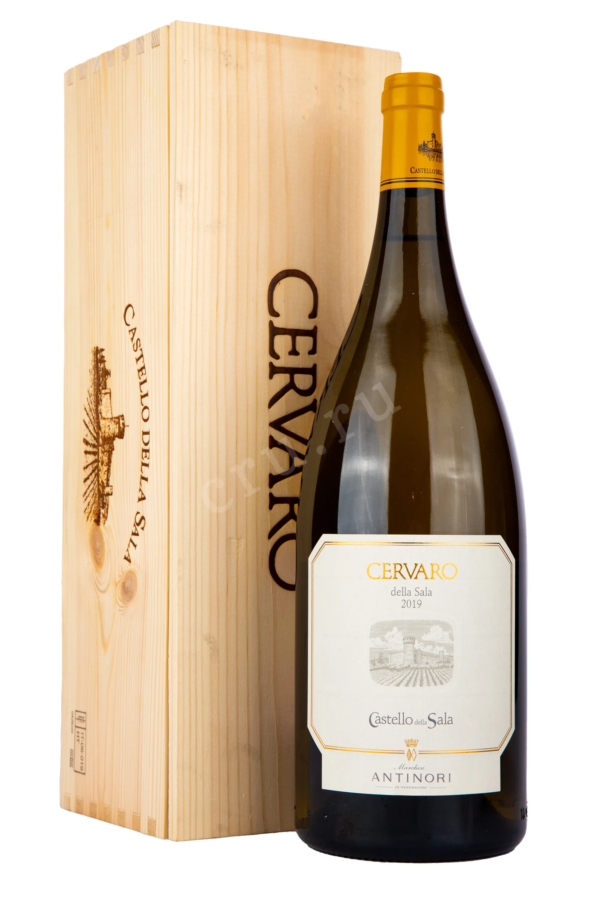 Вино Cervaro della Sala 2019 г. 1,5 л в большой стеклянной бутылке, объем которой в два раза больше традиционного, было произведено на территории итальянской Умбрии из местного винограда ограниченного периода сбора. 13-градусный напиток гарантированного качества получили в результате ферментации и вызревания части сусла в дубовых барриках. Для формирования гармоничного, уравновешенного букета вино поместили на несколько месяцев в погреба выпускающей компании и только потом подвергли реализации. Его можно приобрести в фирменных подарочных боксах из дерева.