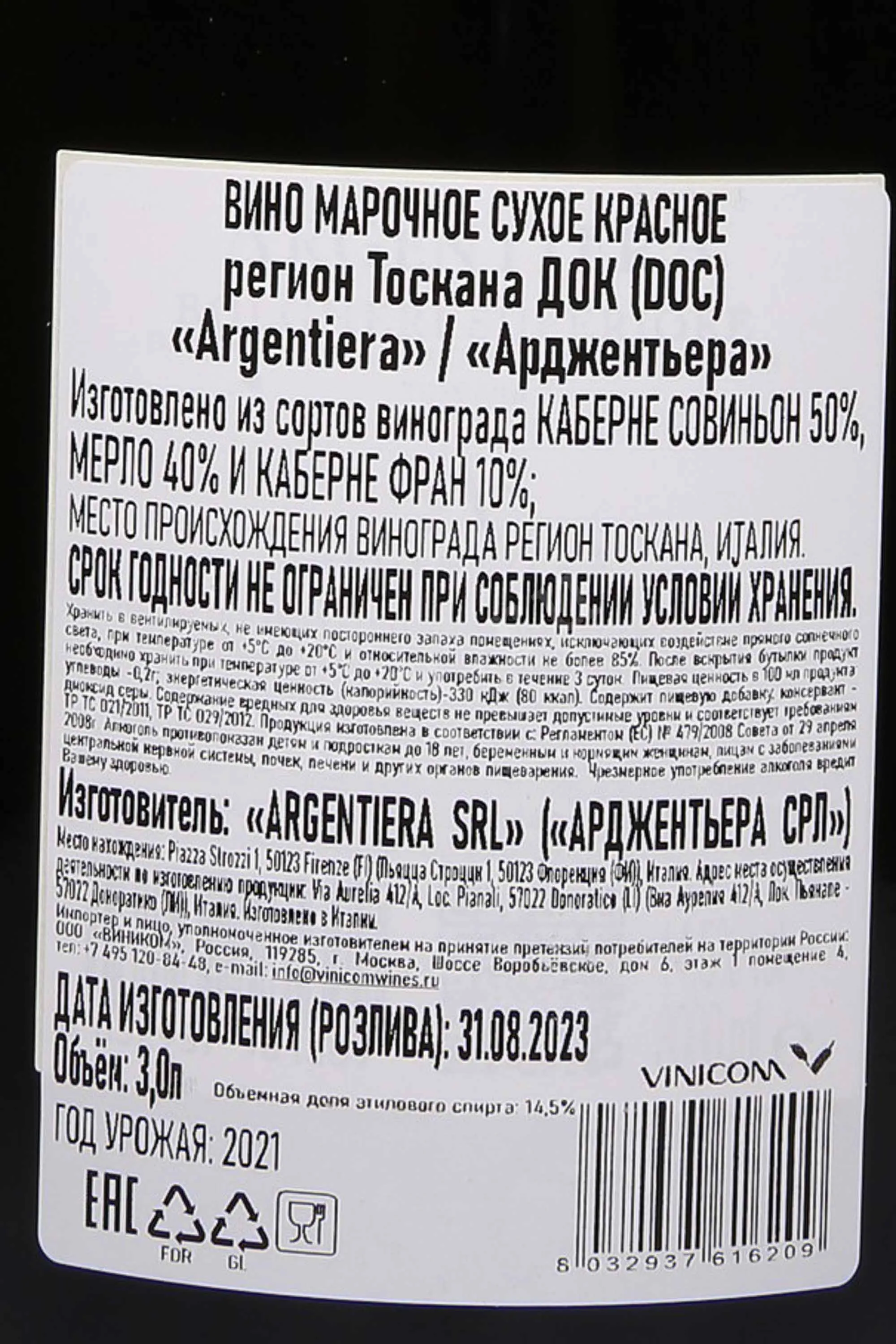 Красное сухое вино Argentiera Bolgheri Superiore DOC 2021 года 3 л в деревянной коробке — мощное во вкусе и одновременно гармоничное, создано в лучших традициях Болгери. Виноградники расположены на высоте 180–200 метров над уровнем моря, на каменистых известково-глинистых почвах с примесью мергелей и сланцев. Терруар обеспечивает винам насыщенный характер и сложный ароматический профиль. 2021 год отличился жарким и сухим летом, что позволило ягодам достичь оптимальной зрелости и сохранить чистоту вкуса. Сбор урожая проводился вручную, винификация проходила отдельно для каждого сорта. Ферментация и мацерация длились около 25 дней при контролируемой температуре. Затем вино выдерживалось 16 месяцев в барриках из французского дуба и еще год дозревало в бутылках. Формат 3 литра подчеркивает коллекционный характер напитка. Винтаж 2021 года получил высокие оценки от критиков Джансис Робинсон и Джеймса Саклинга, а также был включен в рейтинг Verticale.