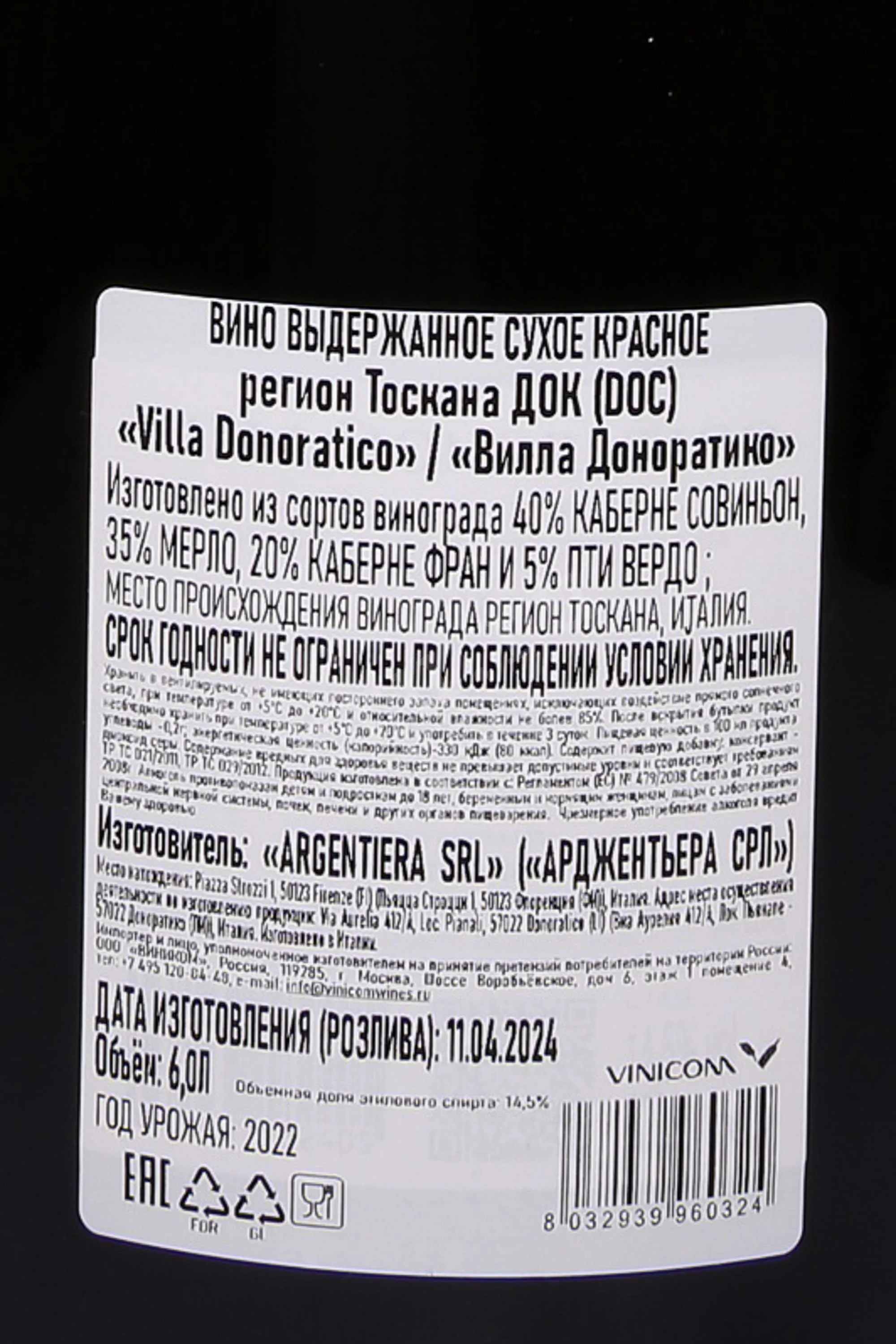 Красное сухое вино Argentiera Villa Donoratico Bolgheri Rosso DOC 2022 года 6 л в деревянной коробке — насыщенное и многогранное, отражающее неповторимый характер терруара Болгери. Виноград выращен на структурированных почвах с известняком, мергелем и сланцем, что придает вину глубину и минеральность. Год урожая 2022 выдался жарким, но в целом сбалансированным в плане погодных условий, благодаря чему ягоды обрели зрелость и гармоничный вкус. Сбор проводился вручную с последующей сортировкой, каждый из 4 используемых сортов винифицировался отдельно. Ферментация проходила при контролируемой температуре до 28 °C в нержавеющих емкостях, мацерация длилась около 20 дней. Затем последовала выдержка в дубовых бочках из Франции и Австрии, после чего купажированное вино отдыхало не менее полугода в бутылках. Уникальность этой версии заключается в редком формате 6 л, что подчеркивает коллекционный статус.