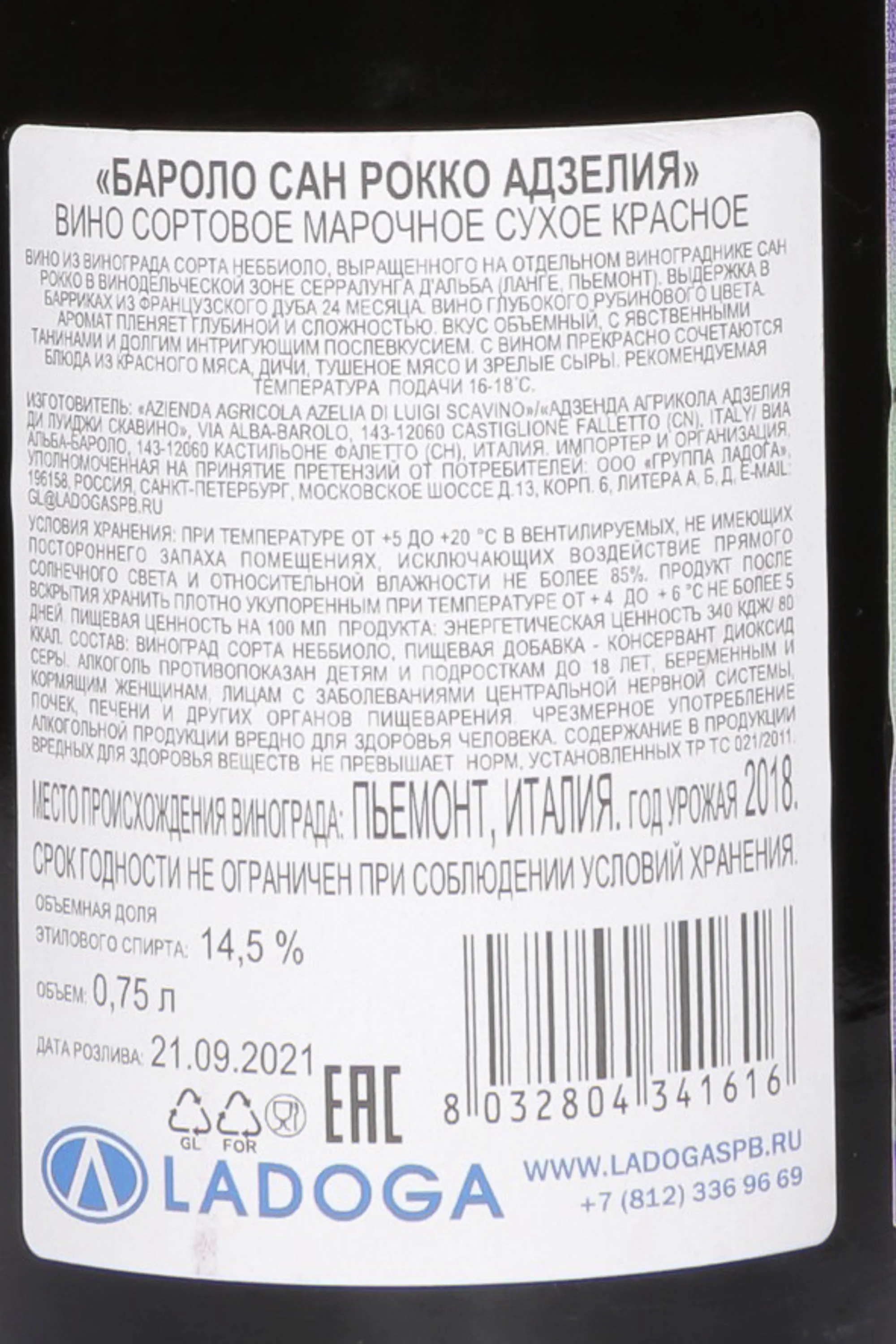 Вино Azelia Barolo San Rocco 2018 0,75 л происходит из знаменитой винодельческой коммуны Серралунга д'Альба в регионе Пьемонт, признанной одним из лучших терруаров для сорта неббиоло. Урожай 2018 года собирался вручную в середине сентября, после чего виноград был подвергнут ферментации и мацерации в стальных ёмкостях с бережным контролем температурного режима. Последующая двухлетняя выдержка во французских дубовых барриках добавляет напитку изящные оттенки и формирует его сложный, узнаваемый характер.