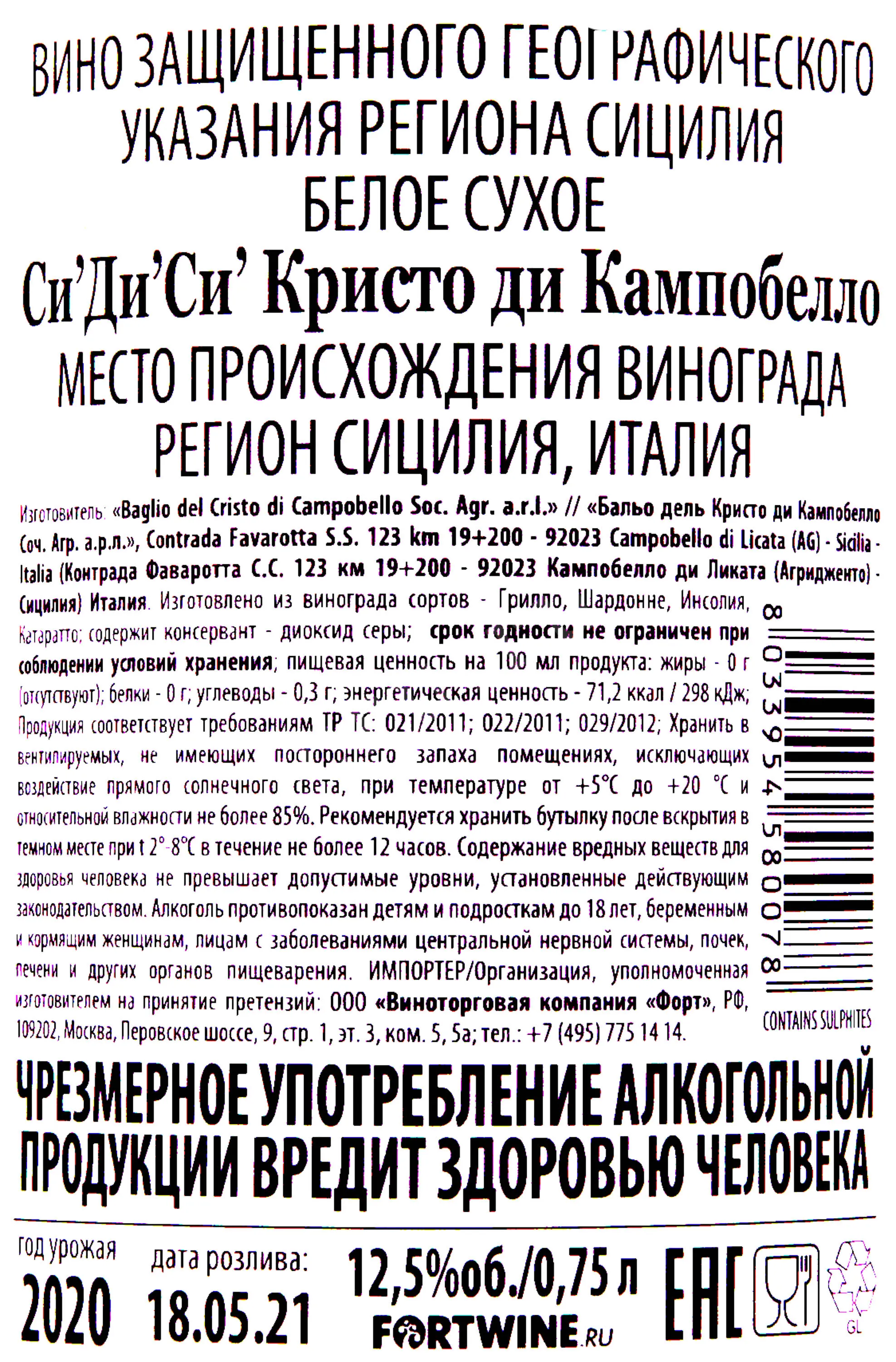 Baglio del Cristo di Campobello C'D'C' Bianco 2020 0.75 л купить - Итальянское вино Бальо дель Кристо ди Кампобелло Си'Ди'Си' Бьянко цена в магазине г. Москва, ул. Профсоюзная, д. 16/10 10:00-22:00 Ежедневно +7 (495) 920-20-02 info@cru.ru