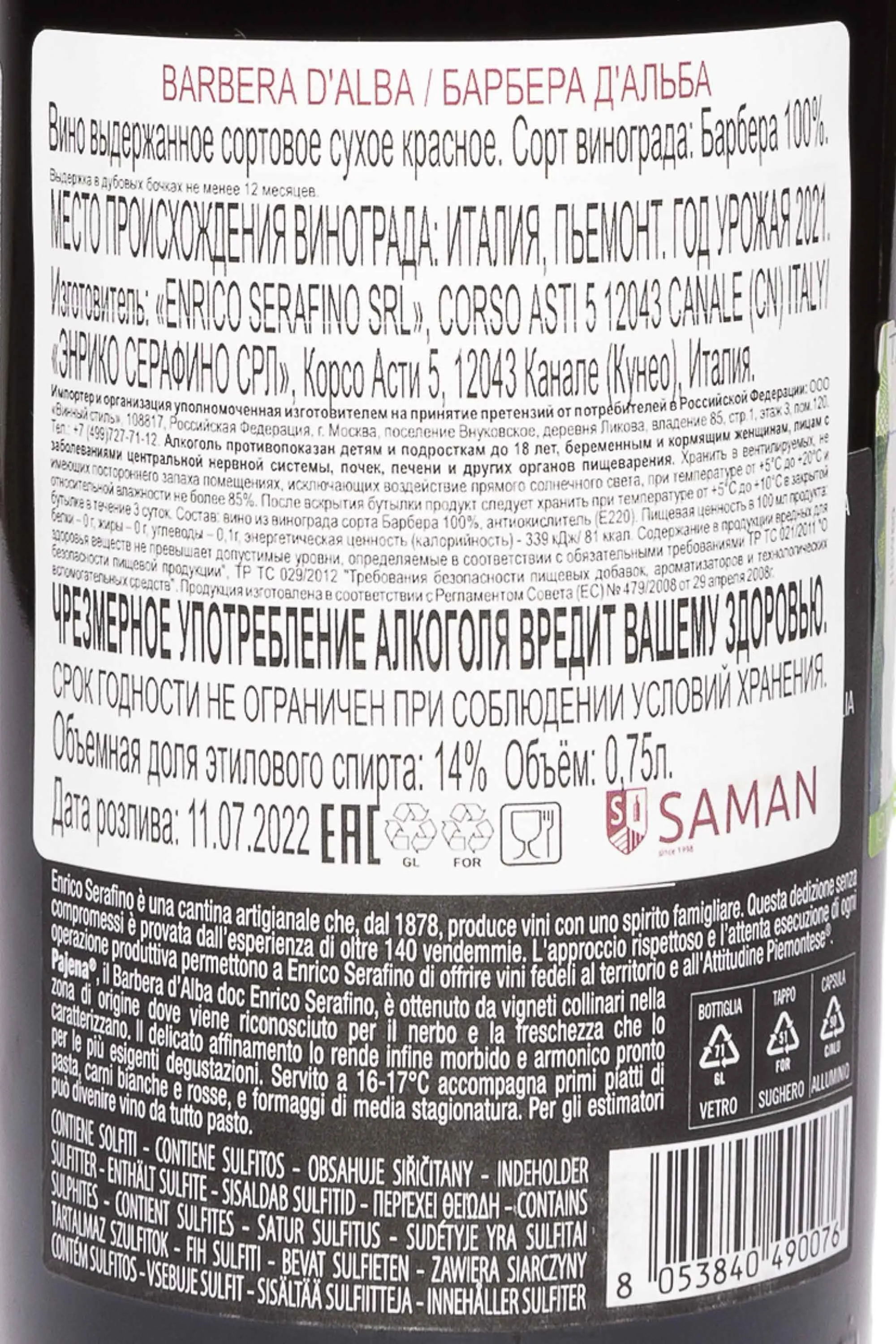 Красное сухое вино Barbera d`Alba Enrico Serafino 2020 г. 0,75 л производится на территории Италии и предлагается в рамках высшей категории классификации DOCG. Оно создано из винограда с нескольких участков винодельческой области Piemonte, где на суглинистых угодьях с примесями песка растут лозы возрастом не более тридцати лет, урожайность достигает 9000 кг/га. Сбор ягод осуществили с использованием ручного труда, после сортировки на вибростоле их охладили и подвергли дроблению с отжимом. В чанах для ферментации поддерживался определенный температурный режим. Вино выдерживалось в дубе не менее одного года. Потенциал его развития после бутилирования составляет около шести лет.