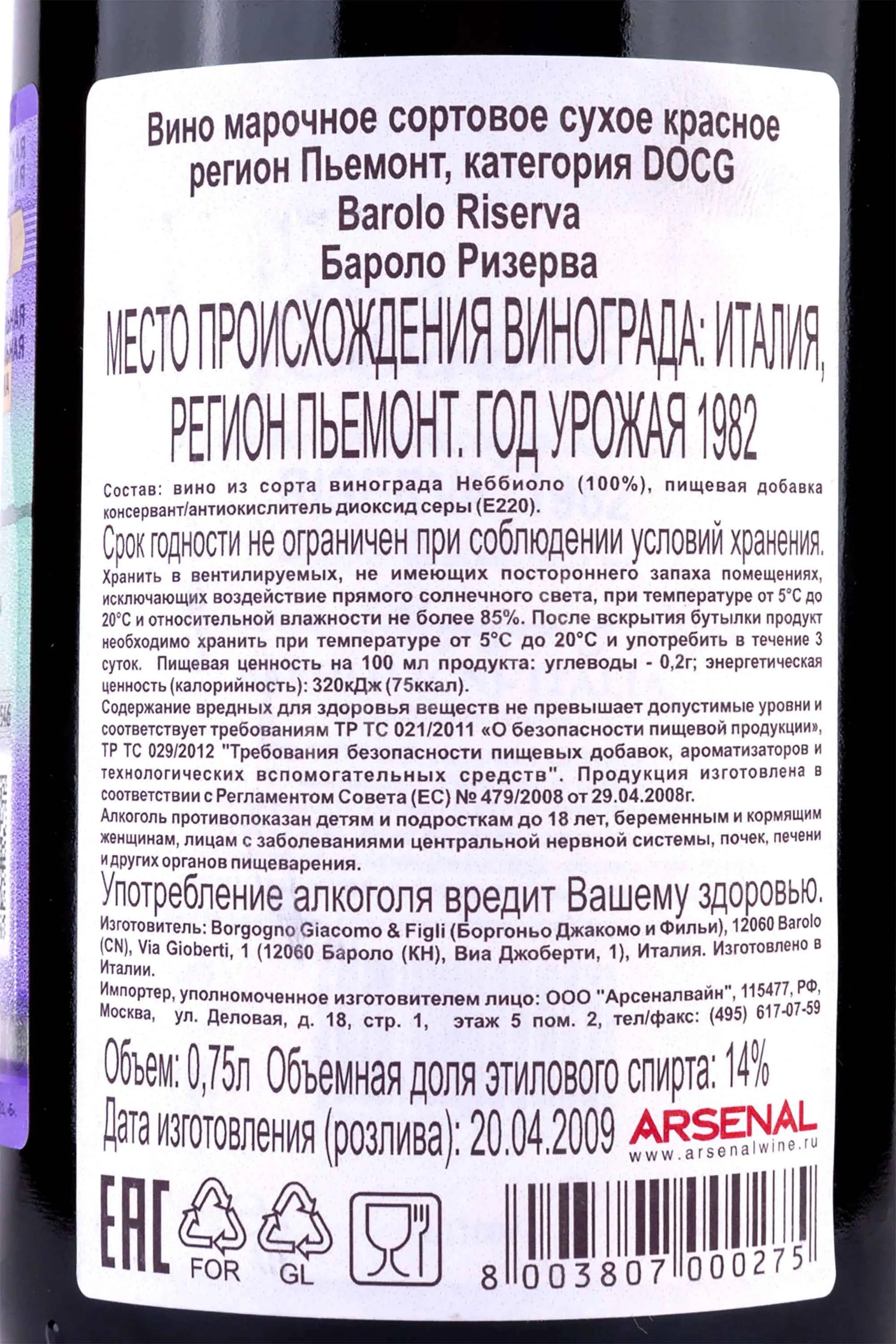 Бароло Ризерва Боргоньо 1982 0.75
