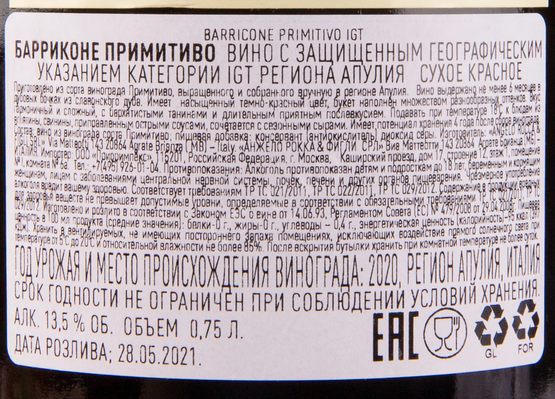 Barricone Primitivo Puglia 2020 0.75 л купить - Итальянское вино Барриконе Примитиво цена в магазине г. Москва, ул. Профсоюзная, д. 16/10 10:00-22:00 Ежедневно +7 (495) 920-20-02 info@cru.ru