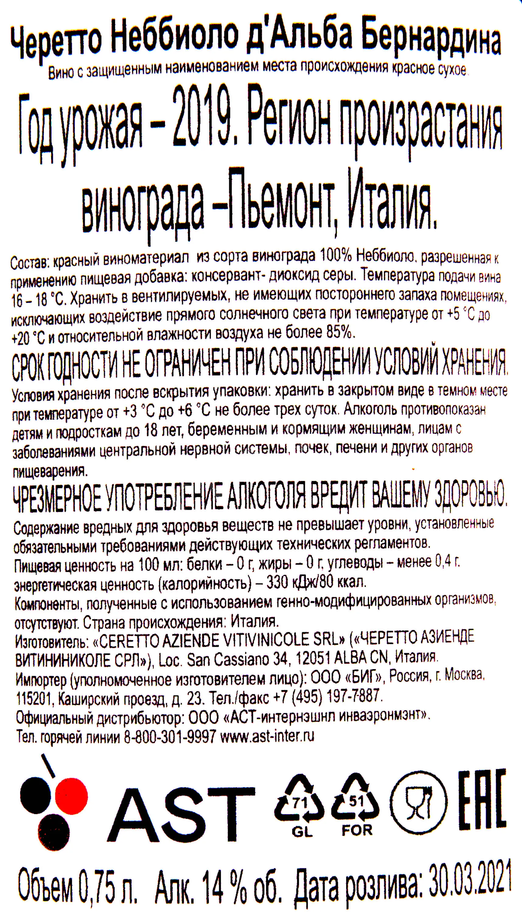 Красное сухое вино Bernardina Nebbiolo D`Alba DOC 2019 г. 0,75 л — 14-процентный алкогольный напиток высокого качества из Италии, произведенный в регионе Piemonte на основе аборигенного сорта винограда одного урожайного сезона. Ягоды с глинисто-илистых плантаций, в которых также содержатся песчаные отложения, собрали ручным способом с лоз средним возрастом 15 лет и подвергли ферментации при термоконтроле в стальных чанах, а после этого поместили в дубовые бочонки на срок от одного года до 15 месяцев. Вино защищенного географического наименования имеет потенциал хранения до 5 лет.