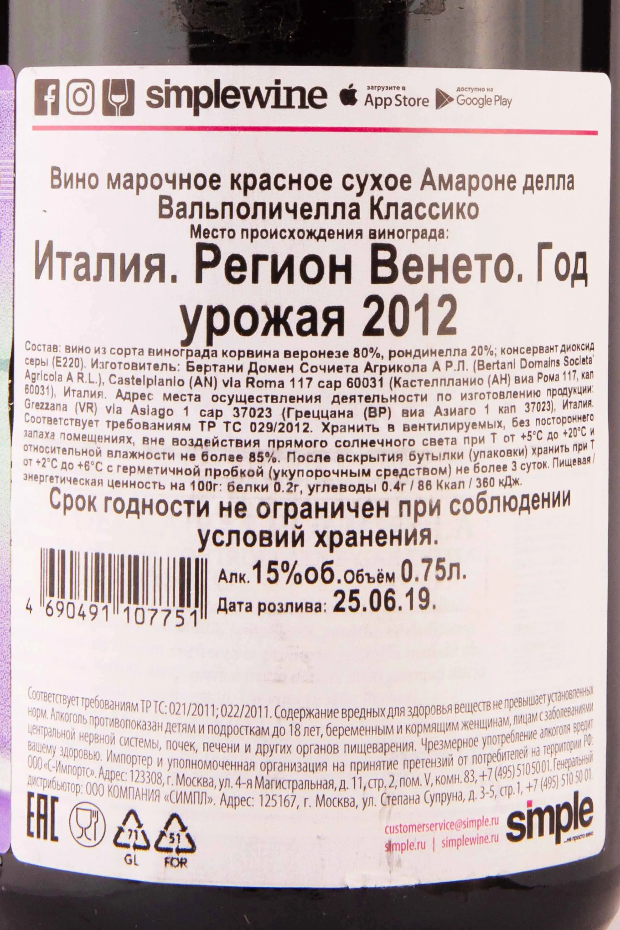Bertani Amarone Della Valpolicella Classico 2012 0.75 л купить - Итальянское вино Бертани Амароне делла Вальполичелла Классико цена в магазине г. Москва, ул. Профсоюзная, д. 16/10 10:00-22:00 Ежедневно +7 (495) 920-20-02 info@cru.ru