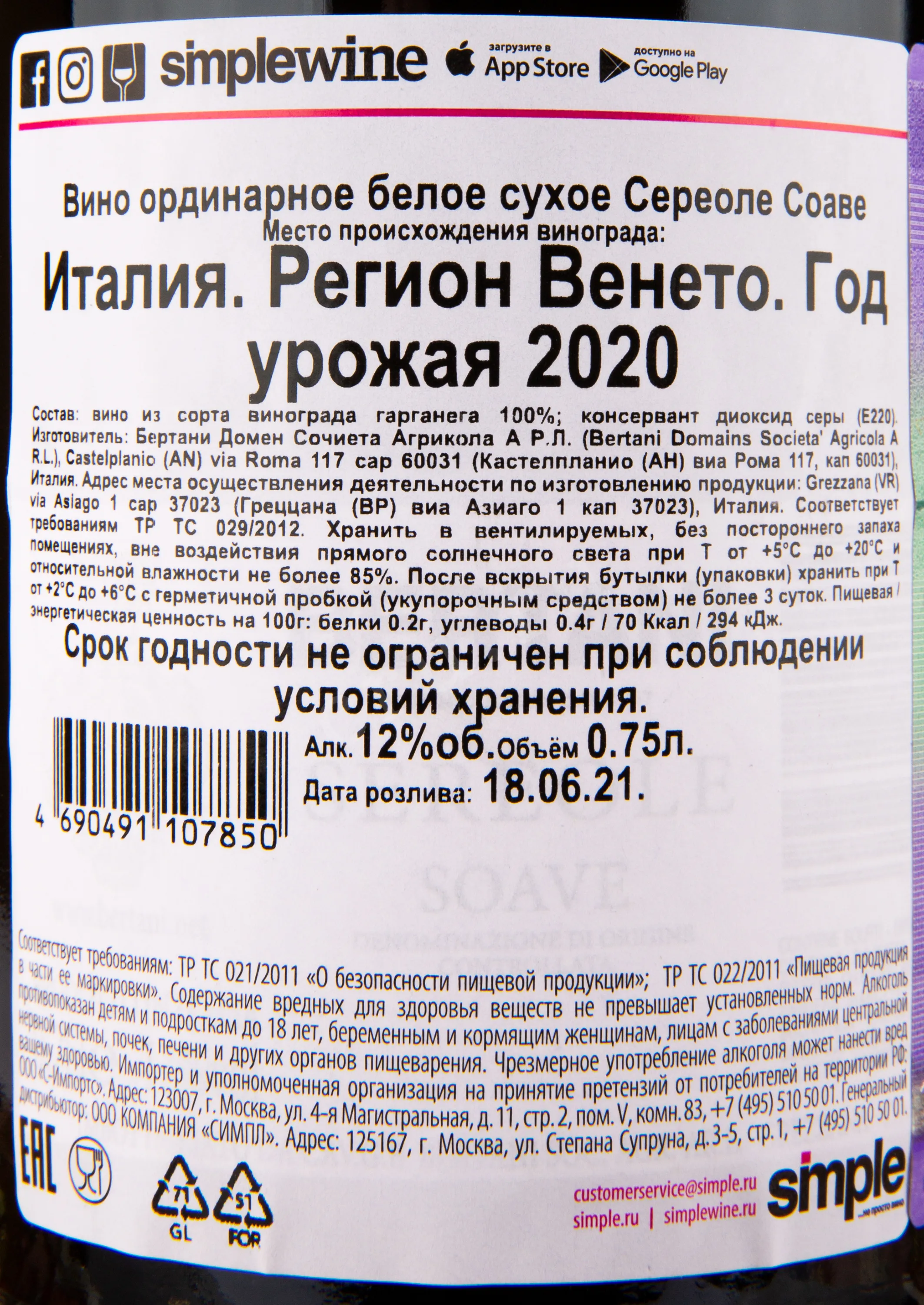 Bertani Sereole Soave 0.75 л - белое сухое итальянское вино из региона Венето. Осуществляется поздний ручной сбор винограда в середине октября, что придает напитку дополнительную свежесть и интенсивность аромата. После гребнеотделения ягоды аккуратно дробят, и часть содержимого оставляют для холодной мацерации. Ферментация проходит в баррелях из французского дуба. Выдерживается вино в дубовых бочках из французского дуба 6 месяцев, а после бутилирования — в бутылках сроком от 3-х месяцев.