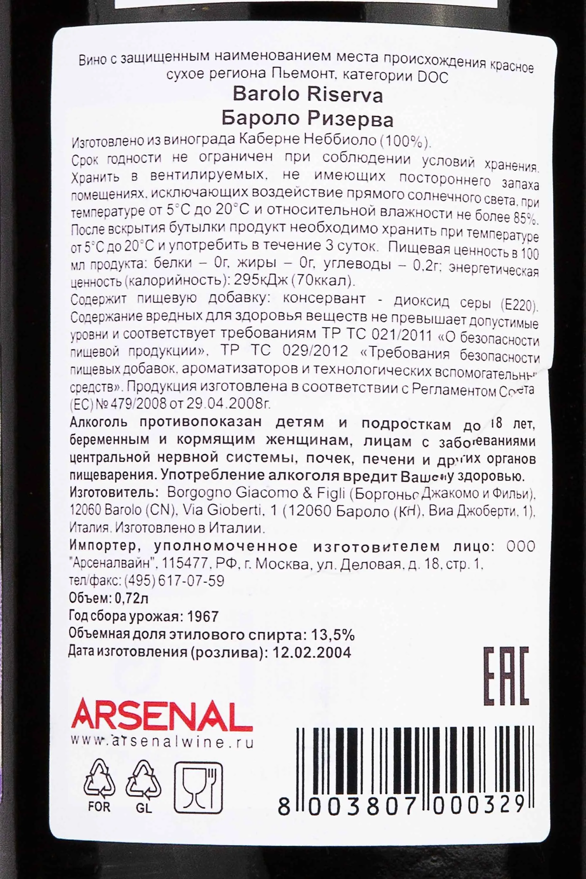 Бароло Ризерва Боргоньо в подарочной упаковке 1967 0.72