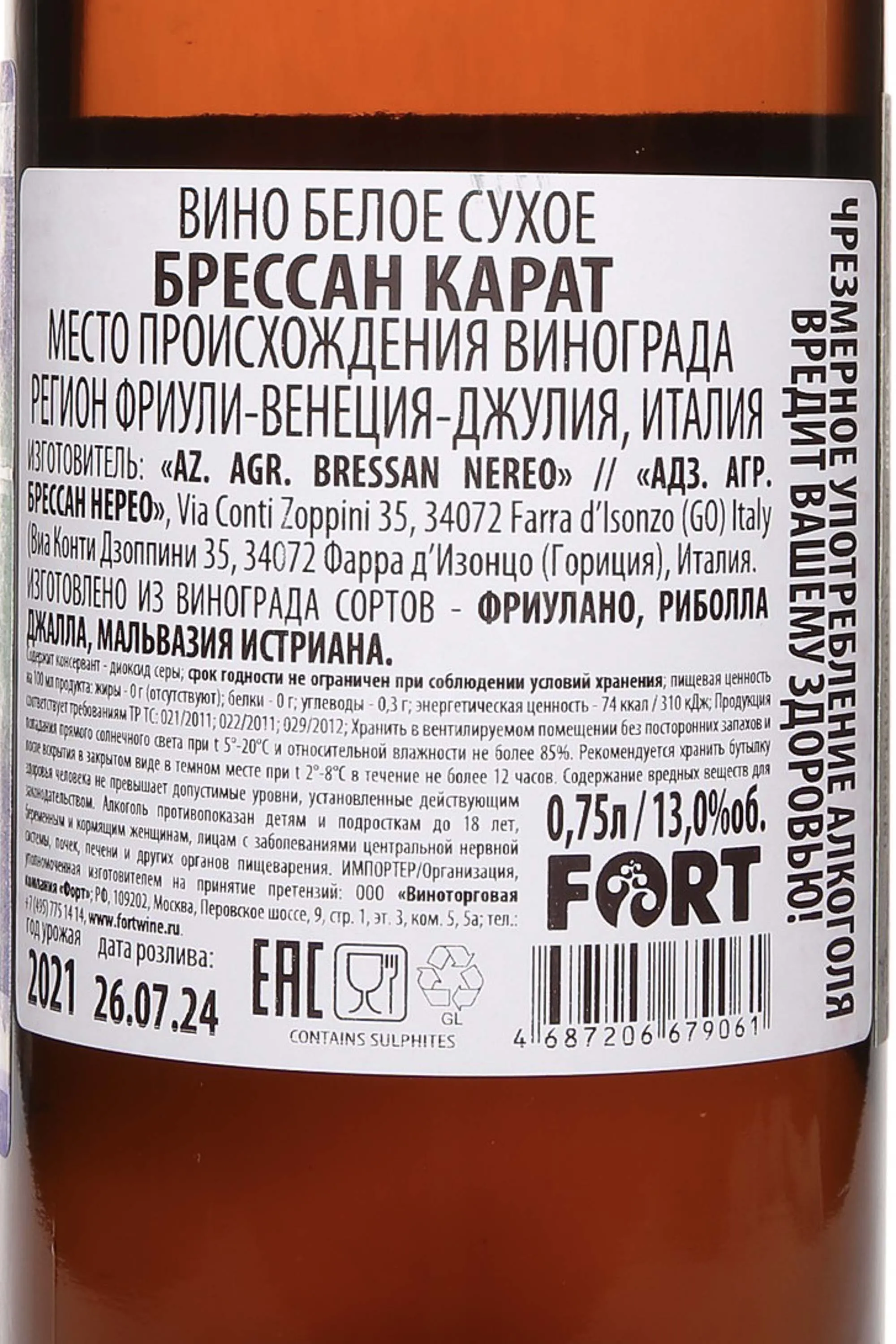 Белое сухое вино Bressan Carat 2021 г. 0,75 л создано на винодельне семьи Брессан, расположенной во Фриули, на границе Италии и Словении. Регион известен каменистыми почвами с высоким содержанием минералов и хорошей дренируемостью. Здесь прохладный альпийский воздух встречается с морскими ветрами Адриатики, создавая баланс температур и позволяя ягодам сохранять кислотность даже в жаркое лето. Урожай 2021 года созрел в условиях умеренной погоды: весна была теплой, без затяжных дождей, а лето отличалось ровным чередованием солнечных дней и прохладных ночей. Это дало напитку выраженную структуру и чистый профиль.