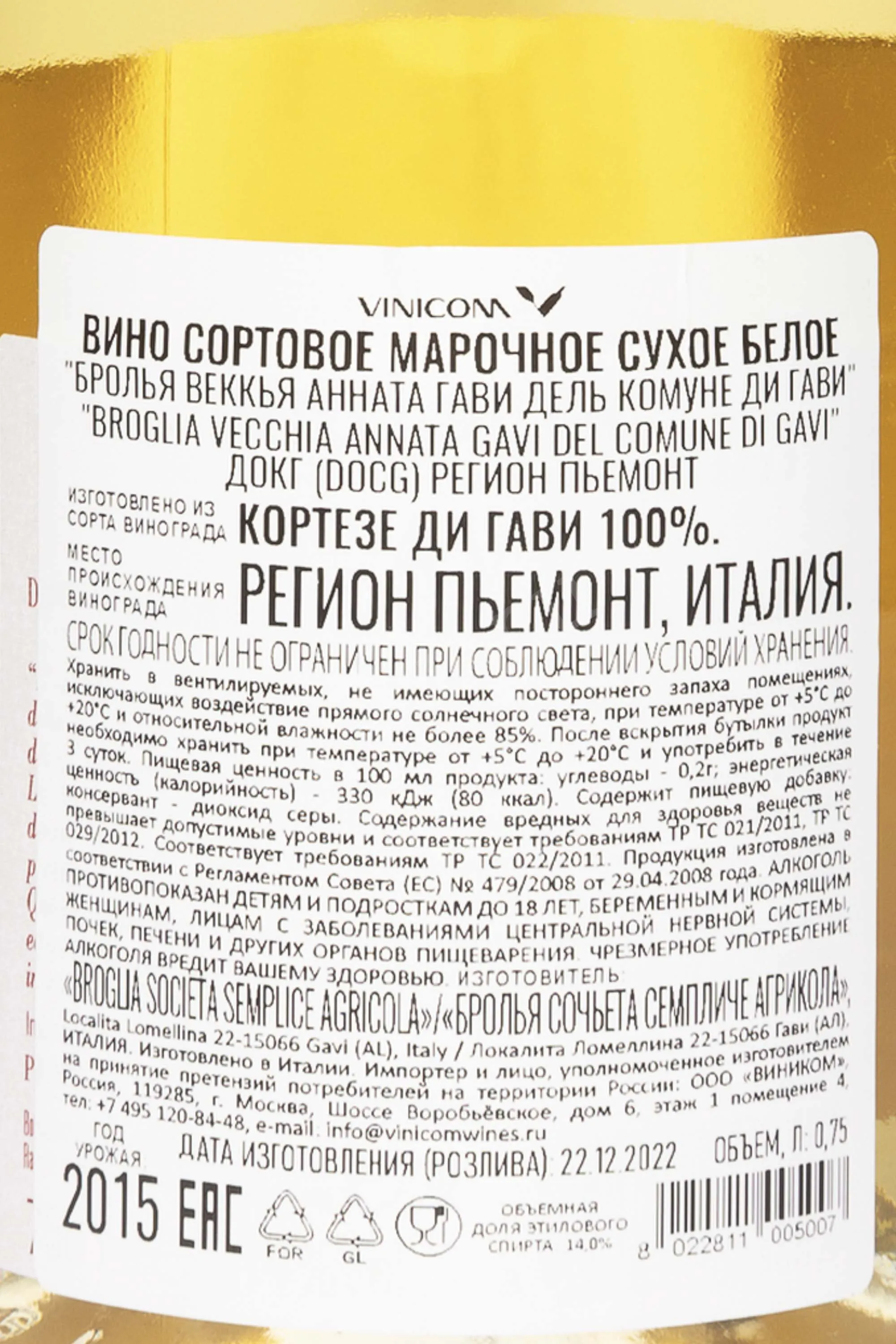 Белое сухое вино Broglia Vecchia Annata Gavi del Comune di Gavi 2015 года 0,75 л — редкий выпуск с выдержанным характером и кристальной кислотностью. Виноград Кортезе был собран со старейших лоз Broglia в Ла Мейрана, высота 300-350 м, известняково-маргелевые почвы обуславливают появление ярких минеральных нот в букете. 2015 год в Гави был с тёплым и сухим летом и прохладным сентябрем. Ягоды созрели равномерно, урожай отличался концентрированной органолептикой. Сбор сырья осуществлялся вручную в маленькие деревянные ящики. Ферментация проходила в нержавеющей стали при контролируемой температуре. Затем вино долго выдерживалось на тонком осадке в стальных танках — 9 лет, что добавило обеспечило ему глубину, кремовость и стабильность вкуса. Бролья Веккья Анната Гави дель Комуне ди Гави выпускается только в исключительные годы. Винтаж 2015 получил 2 бокала из 3 от Gambero Rosso («Восхитительное вино»), 89 баллов от Luca Maroni («Превосходное»), и 91 балл от Decanter | 100 («Яркое»).