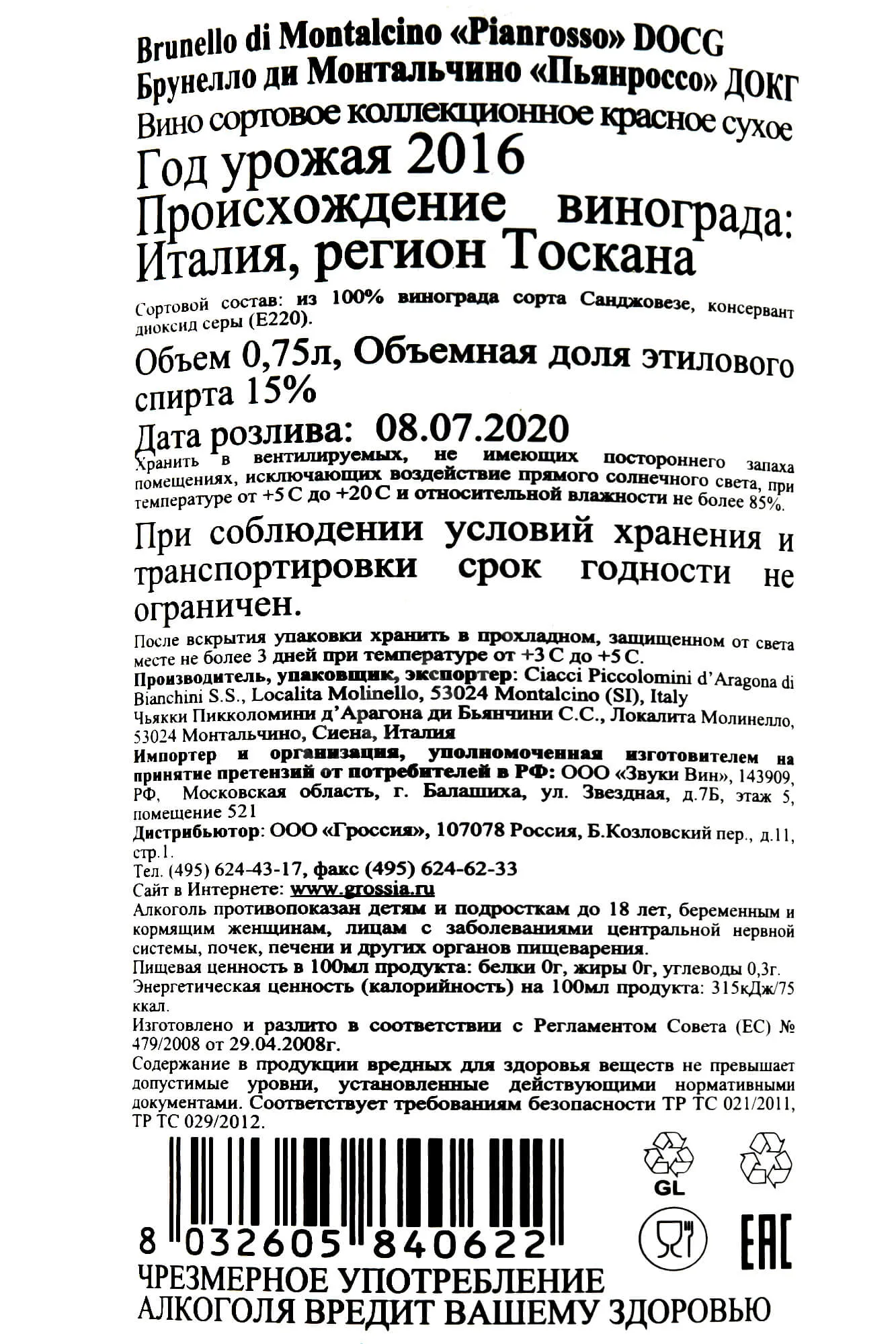 Брунелло ди Монтальчино ДОКГ Пьянроссо 2016 0.75