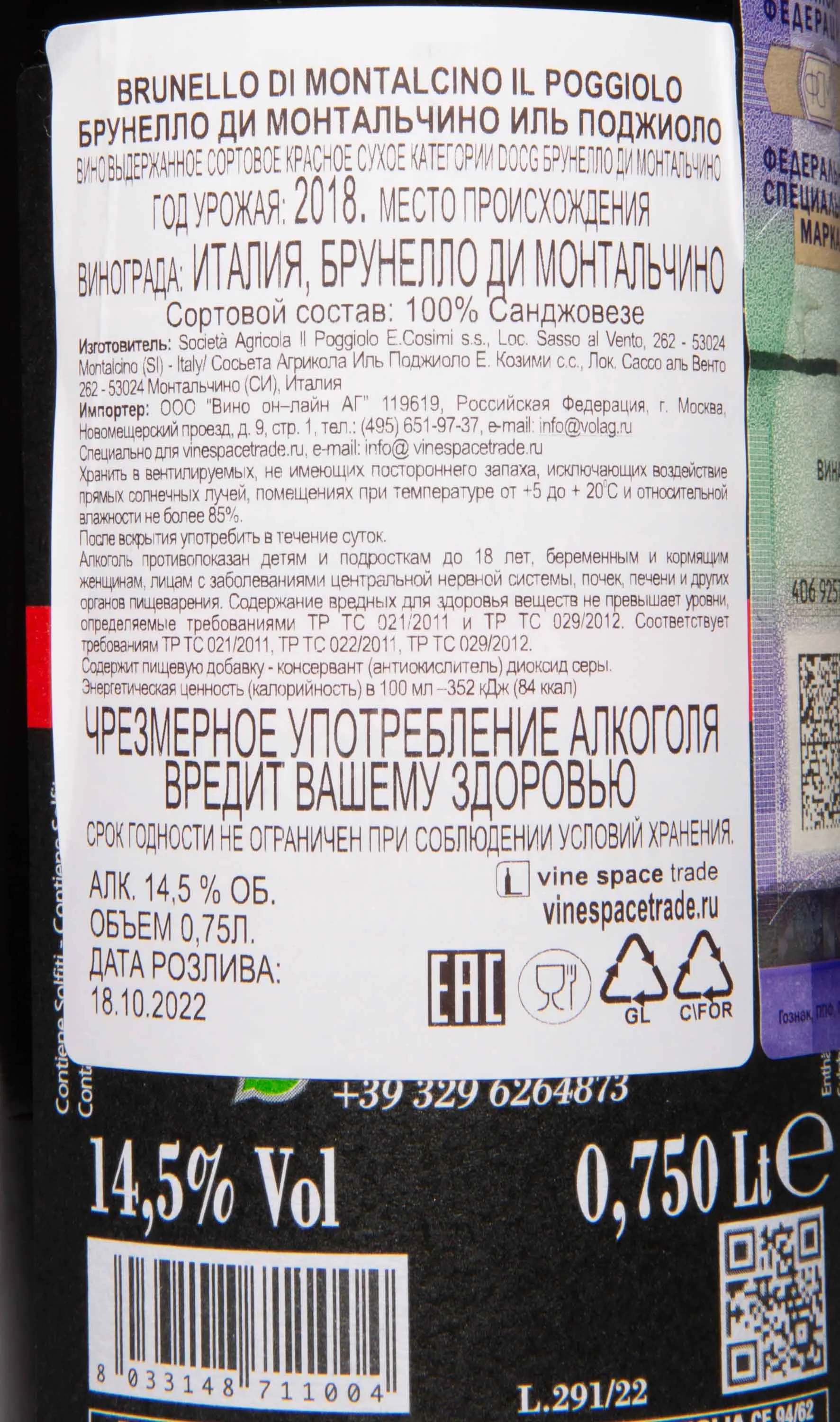 Красное сухое вино Brunello DI Montalcino Il Poggiolo 2018 год 0.75 л было создано из винограда сорта Санджовезе Гроссо, выращенного на виноградниках исторической зоны Монтальчино в Тоскане. Урожай собирали вручную, тщательно отбирая только зрелые ягоды. Особенность технологии заключалась в длительной ферментации на мезге при контролируемой температуре и последующей выдержке в дубовых бочках не менее двух лет, благодаря чему вино приобрело глубокий характер и насыщенную структуру. Финальная выдержка в бутылках продолжалась дополнительно три года, позволив напитку полностью раскрыть свой потенциал.