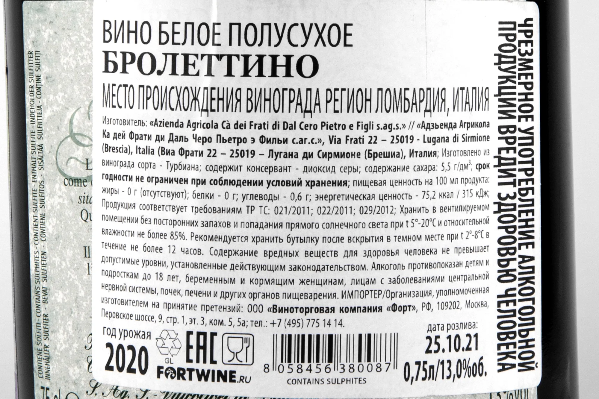Белое полусухое вино Ca` dei Frati Brolettino 2020 г. из тщательно отобранного итальянского винограда, выращенного на экологически чистых территориях Ломбардии и собранного в осенний сезон одного года, было произведено в соответствии с классической рецептурой. Спелые ягоды подверглись винификации в дубовых и стальных емкостях, затем была проведена 10-месячная выдержка в древесной таре. Потенциал хранения вина достигает четырех-пяти лет.