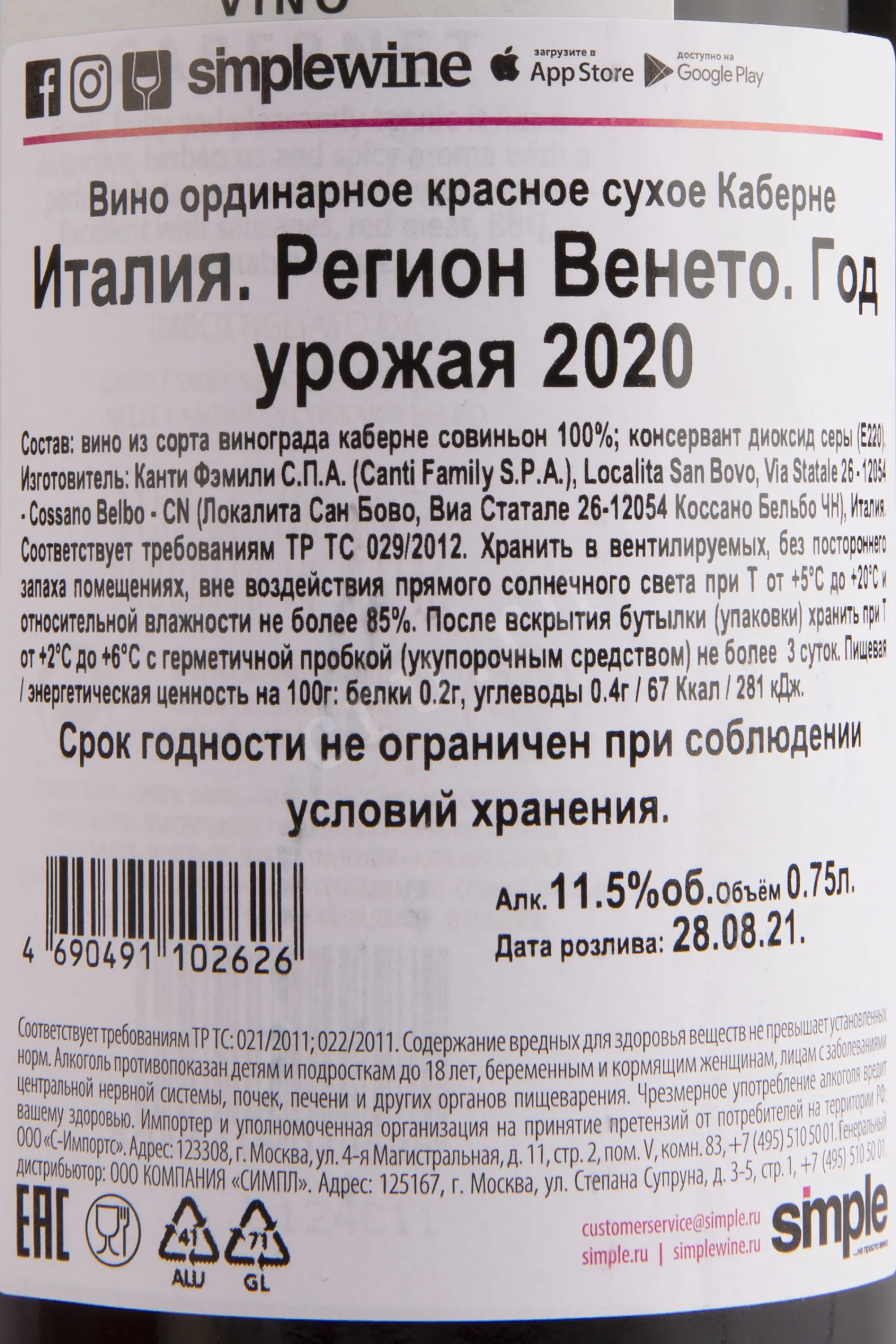 Вино Cabernet Canti 2020 г 0.75 l – это итальянский винтаж премиального класса. Название напитка переводится как «песни» или «спой!», что отражает жизнерадостность и страстность итальянцев. Моносортовое красное сухое вино изготавливается из винограда, культивируемого на собственных плантациях компании. Напиток крепостью 11.5% изготавливается традиционным методом без выдержки в дубовых барриках, при этом имеет потенциал хранения до 2-х лет.