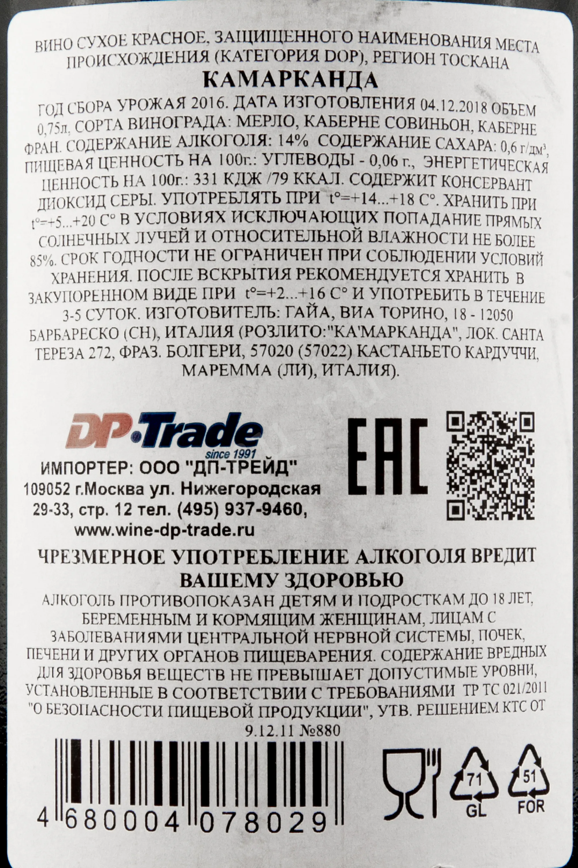 Красное сухое вино Camarcanda 2016 год 0,75 л состоит из трех вариаций винограда Италии, которые собрали на участках Тосканы с известняковым составом почв, находящихся в собственности семейного хозяйства с мировым именем. Дорогостоящий терруарный алкоголь изготовлен по методу раздельного сбраживания: каждый сорт из его состава обрабатывался индивидуально в своем чане. Сусло смешали только после малолактической ферментации и годичной выдержки в дубовых бочонках, а также нахождения в бетонных баках на протяжении шести месяцев. До реализации бутилированное вино несколько месяцев «отдыхало» и настаивалось в расположенных глубоко под землей погребах винодельческой компании.
