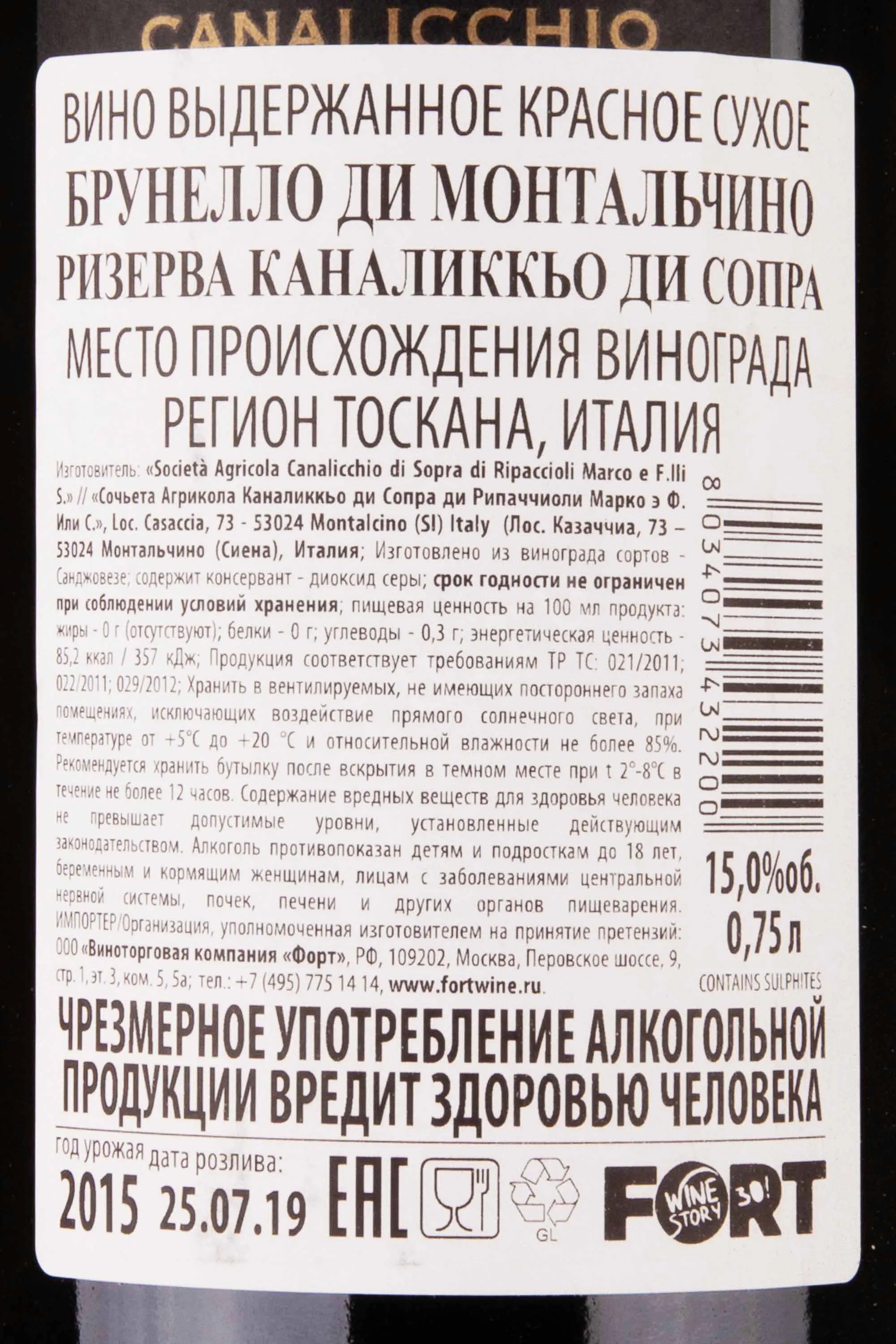 Брунелло ди Монтальчино Ризерва Каналиккьо ди Сопра 2015 0.75