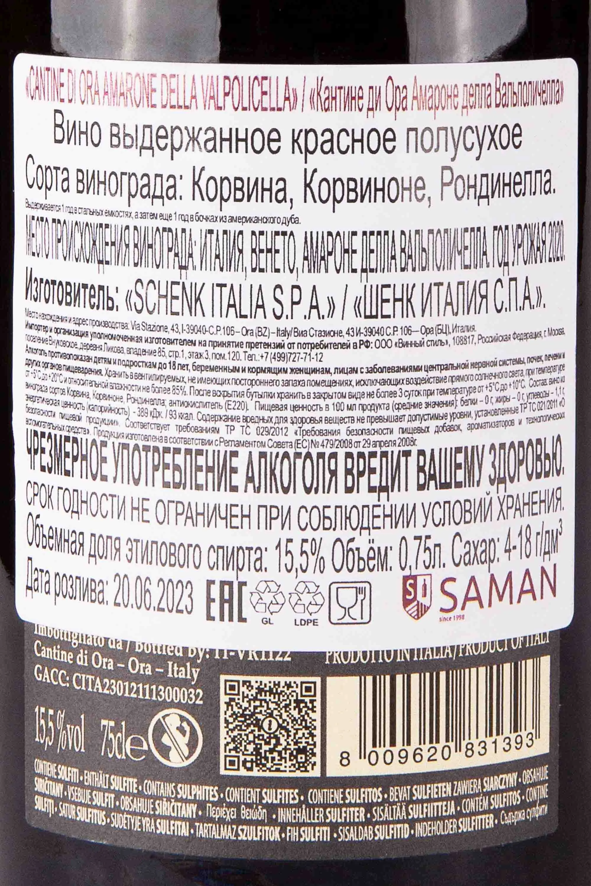 Вино Cantine Di Ora Amarone della Valpolicella 2020 0,75 л рождается в традиционном винодельческом районе Вальполичелла Классико, что в итальянской области Венето. Особенностью производства является старинная техника заизюмливания винограда на воздухе до полугода, благодаря чему ягоды приобретают уникальную концентрацию вкусов и сахаров. Затем следует неспешная ферментация с дополнительной десятидневной мацерацией в стальных ёмкостях. Для выдержки вина используются стальные резервуары в течение года, а затем дубовые бочки из американского дуба еще на 12 месяцев, что придаёт напитку его знаменитую глубину.