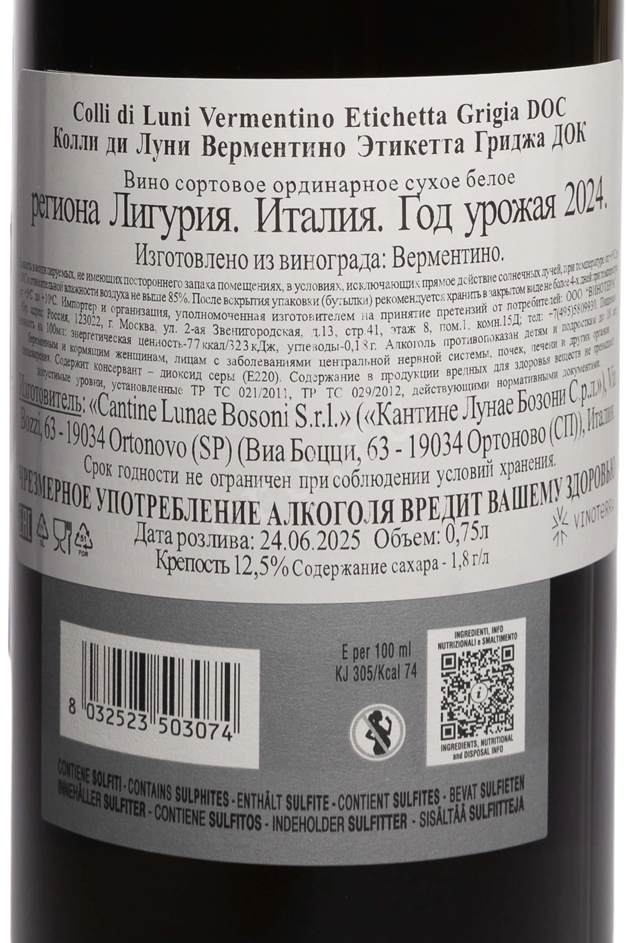 Белое сухое вино Cantine Lunae Vermentino Etichetta Grigia Colli di Luni 2024 года 0,75 л — классическое выражение сорта Верментино и один из флагманов хозяйства Кантине Лунае. Именно с него более сорока лет назад началась история работы Паоло Босони с этим сортом, и со временем вино стало символом винодельни. Сырье для него выращивается в зоне Колли ди Луни, у подножия холмов между Лигурией и Тосканой. Здесь преобладают каменистые почвы с хорошим дренажом, а зрелые лозы возрастом около 35 лет дают спелый виноград с высокой концентрацией сахаров и ароматических веществ. В 2024 году погодные условия в целом были благоприятными, с достаточным количеством солнечных дней и умеренными осадками. Урожай собирали вручную в сентябре. Ферментация проходила в стальных резервуарах при контролируемой температуре, затем вино около трех месяцев выдерживалось на тонком осадке в нержавеющей стали. Такой подход позволил подчеркнуть природный характер Верментино, сохраняя баланс между свежестью, элегантностью и легкой пикантной глубиной. Винтаж 2024 года получил медаль на конкурсе International Wine Challenge, 17/20 баллов от критика Джансис Робинсон и 93/100 от Джеймса Саклинга.