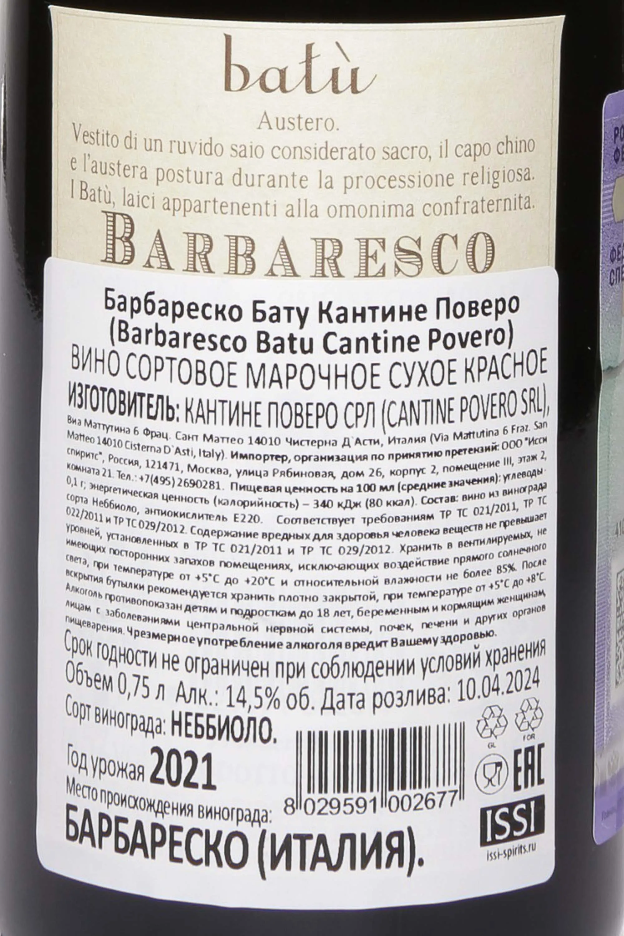 Вино Cantine Povero Barbaresco Batu DOCG 2021 года 0,75 л создано в классическом стиле Пьемонта и отражает характер вин из Неббиоло. Виноград выращен на холмах Ланге с богатой известняково-глинистой почвой и мягким альпийским климатом, где теплые дни и прохладные ночи помогают сохранить баланс кислотности и аромата. Урожай 2021 года в регионе был удачным: зима была снежной, весна умеренно дождливой, а лето сухим и теплым, что позволило ягодам достичь оптимальной зрелости. Виноград собирали ручным способом и отделили от гребней, затем мягко прессовали. Ферментация проходила в стальных емкостях при контролируемой температуре (не выше 30 градусов) в течение 2 недель. Проводилась малолактика, затем вино выдерживалось в больших дубовых бочках 26 месяцев для смягчения танинов и раскрытия букета. Это Барбареско получило награды на конкурсах India Wines and Spirits Award и Mundus Vini. Винтаж 2021 года будет развиваться в бутылке на протяжении двух десятилетий.
