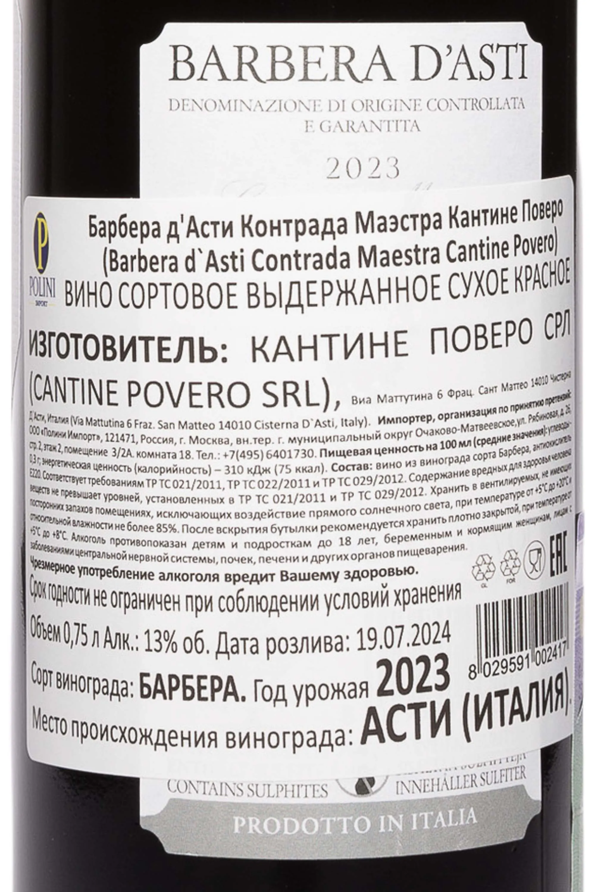 Вино Cantine Povero Barbera D'Asti Contrada Maestra DOCG 2023 0.75 л представляет собой выразительный пример традиций Пьемонта, воплощённых в элегантной Барбере. Урожай собирают вручную на холмах Монферрато, где известняково-глинистые почвы и мягкий континентальный климат создают идеальные условия для раскрытия сортового характера. Виноград выращивается на склонах с южной экспозицией, что обеспечивает оптимальное созревание и насыщенность аромата. Ферментация проходит в нержавеющих стальных емкостях при контролируемой температуре около 28 °C, затем следует малолактическое брожение, смягчающее естественную кислотность сорта. Выдержка длится около шести месяцев в стали, что позволяет сохранить свежесть, чистоту вкуса и природную фруктовость без влияния дуба. Напиток демонстрирует баланс между энергией молодой Барберы и изяществом винодельческого почерка Cantine Povero.