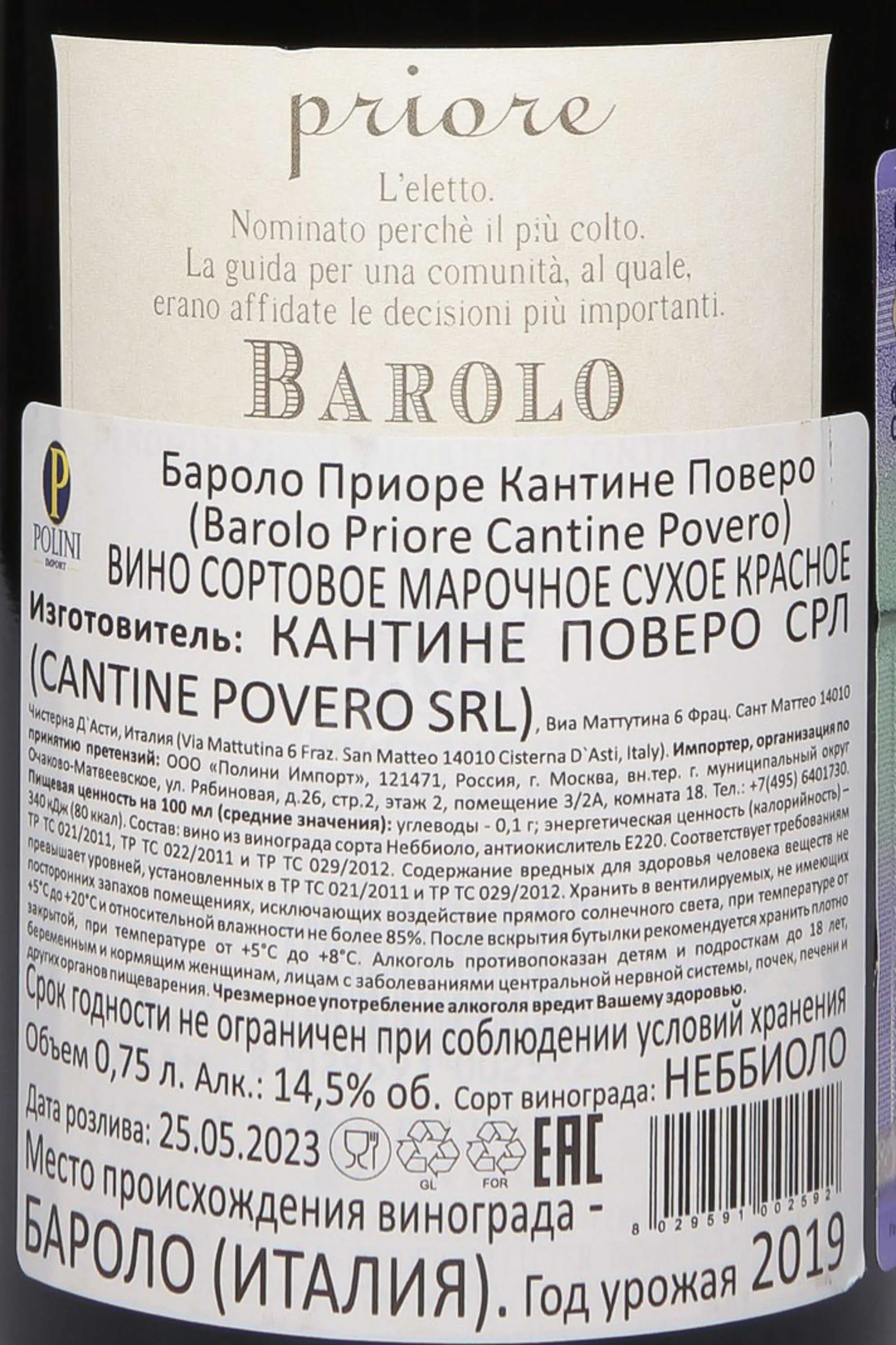 Cantine Povero Barolo Priore DOCG 2019 0.75 л купить - Итальянское вино Бароло Приоре Кантине Поверо цена в магазине г. Москва, ул. Профсоюзная, д. 16/10 10:00-22:00 Ежедневно +7 (495) 920-20-02 info@cru.ru