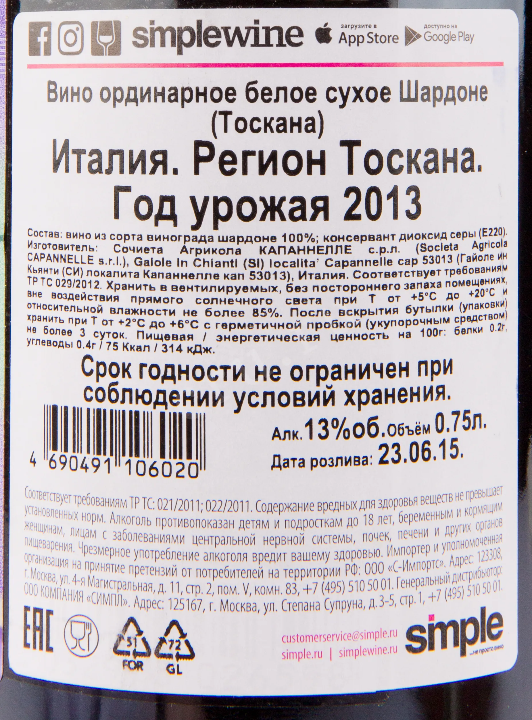 Capannelle Chardonnay Toscana 2013 0.75 л купить - Итальянское вино Капаннелле Шардоне Тоскана цена в магазине г. Москва, ул. Профсоюзная, д. 16/10 10:00-22:00 Ежедневно +7 (495) 920-20-02 info@cru.ru
