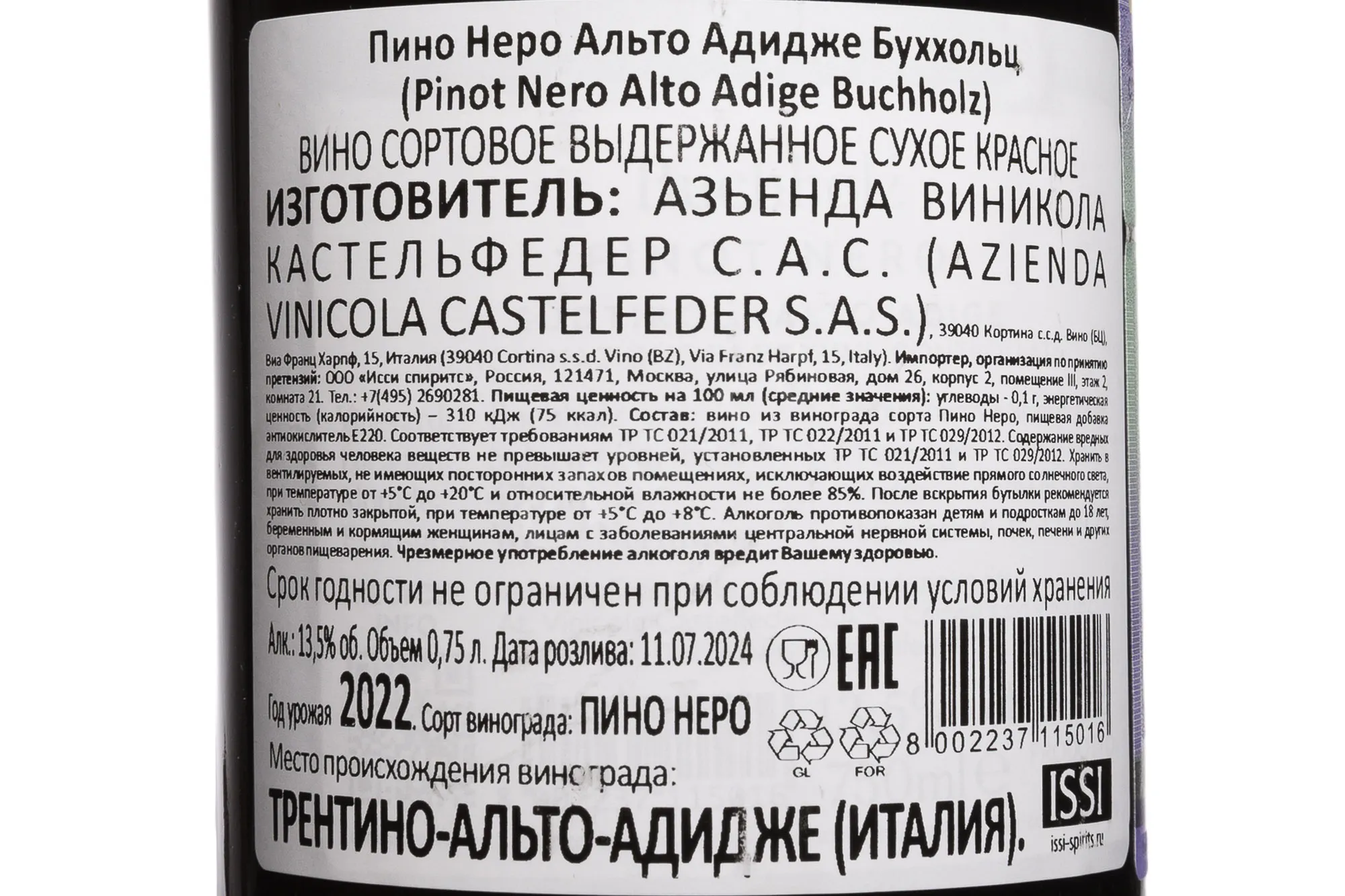 Красное сухое вино Castelfeder Buchholz Pinot Nero Sudtirol Alto Adige DOC 2022 г. 0,75 л создано на высокогорных склонах Альто-Адидже, где виноградники расположены на отметках 600–700 метров над уровнем моря. Здесь прохладный климат и известняково-доломитовые почвы формируют тонкий стиль классического темнокожего винограда с подчёркнутой свежестью и устойчивой структурой. Урожай дал ягоды с гармоничным соотношением сахара и кислотности, что позволило виноделам получить чистый, точный напиток без лишней плотности. В процессе производства применили деликатную ферментацию на кожице, мягкое прессование и выдержку не мене 12 месяцев в больших бочках, чтобы сохранить природную элегантность сорта.