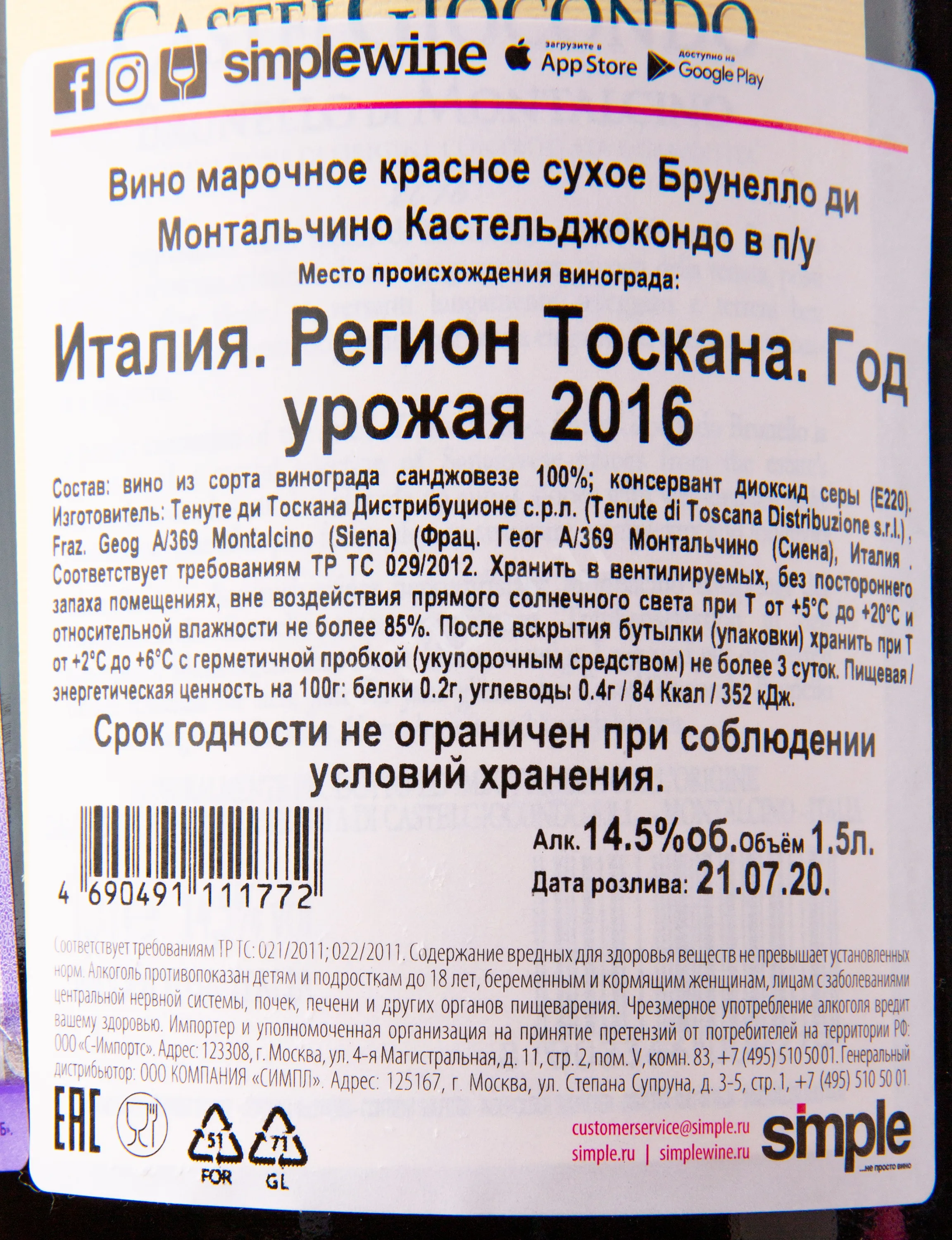 Красное сухое вино Castelgiocondo Brunello di Montalcino 2016 г. в большой полуторалитровой бутылке, которую можно выбрать для крупного торжества, присутствует в ассортименте известного итальянского хозяйства. Основой напитка послужил виноград одного сорта с холмов Монтальчино, собранный на пике зрелости в течение ограниченного урожайного периода. Сырье прошло стадии 12-суточного сбраживания в емкостях из нержавеющей стали, а также вызревания во французских и славонских дубовых бочках сроком 48 месяцев. Оптимальный период для употребления этого вина — с 2022 по 2032 г.