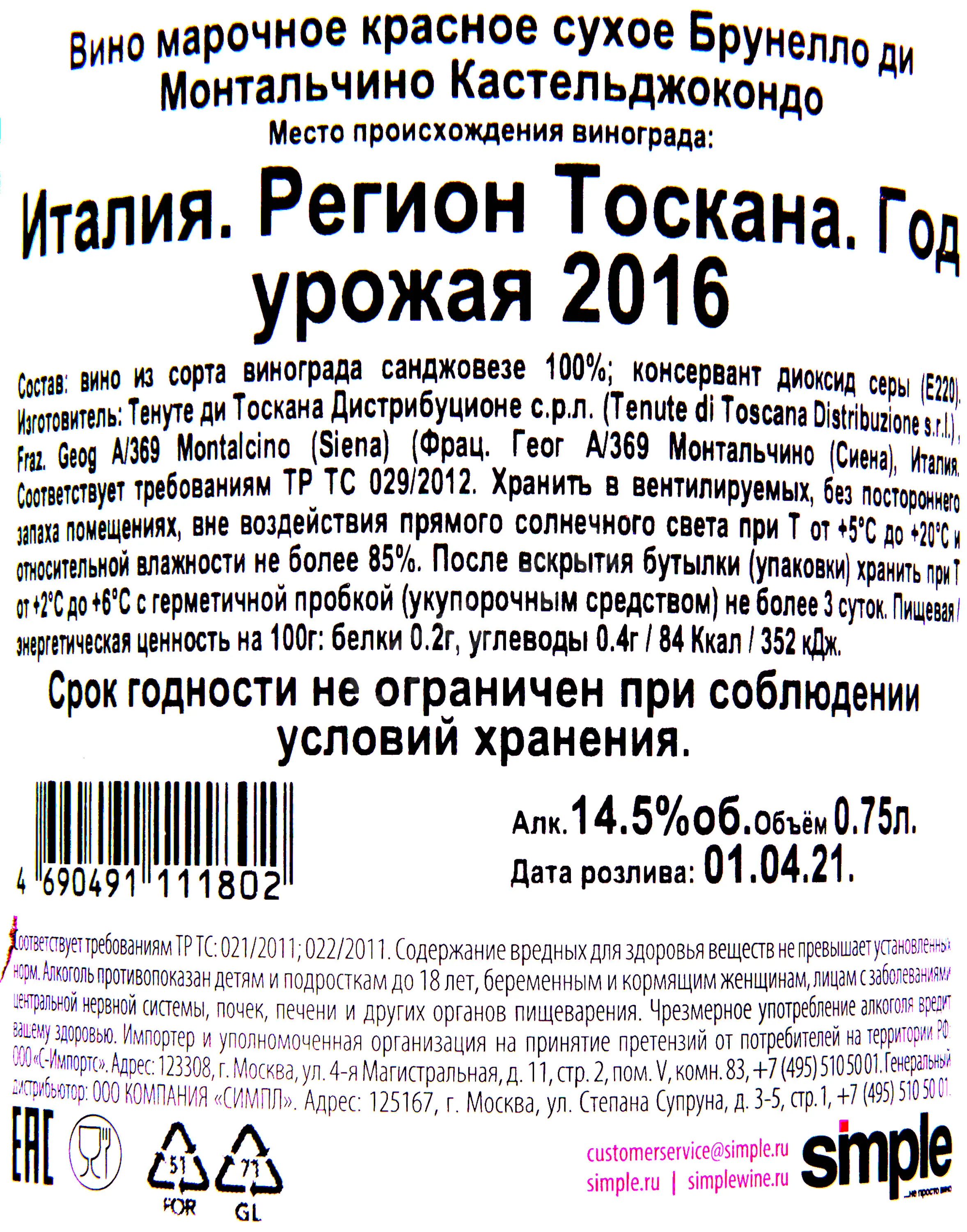 Брунелло ди Монтальчино Кастельджокондо 2016 0.75