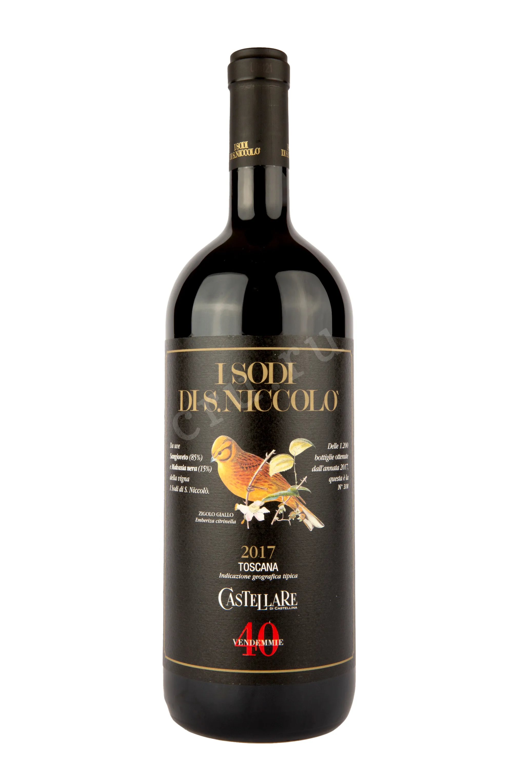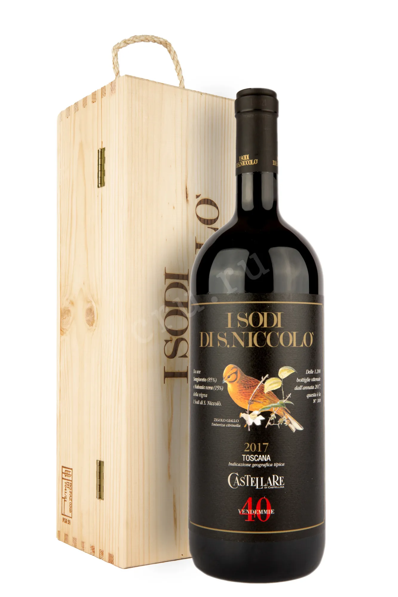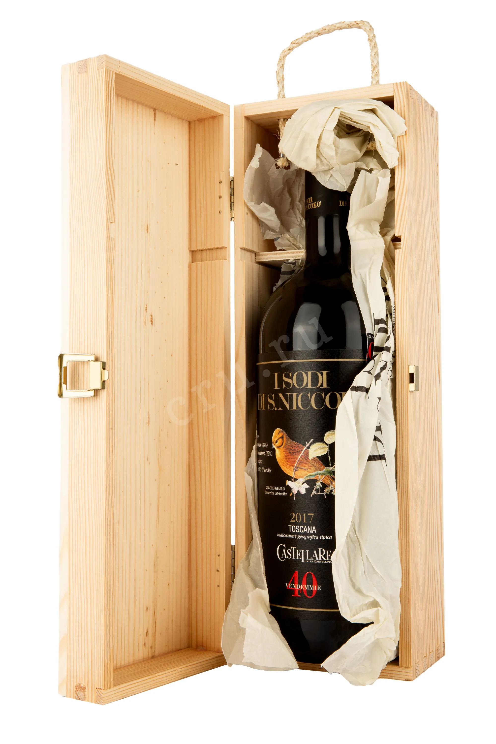 Вино Castellare I Sodi di San Nicolo in gift box 2017 г. выпущено в паре с солидным деревянным ящичком, который оснащен тканевой ручкой для удобной транспортировки. 14-градусный высококачественный напиток Италии содержит виноград одного года сбора с угодий лучших частей Тосканы (высота расположения от 350 до 400 м над уровнем моря), образованных минеральными, известняковыми и глинистыми породами. Все этапы изготовления осуществились с применением ручного труда, в том числе сбраживание и выдержка сроком 24-30 месяцев в новых и старых французских дубовых бочонках. После розлива вино крепостью 13,5 градуса еще год дозревало в стекле. Его потенциал к хранению составляет как минимум 20 лет.