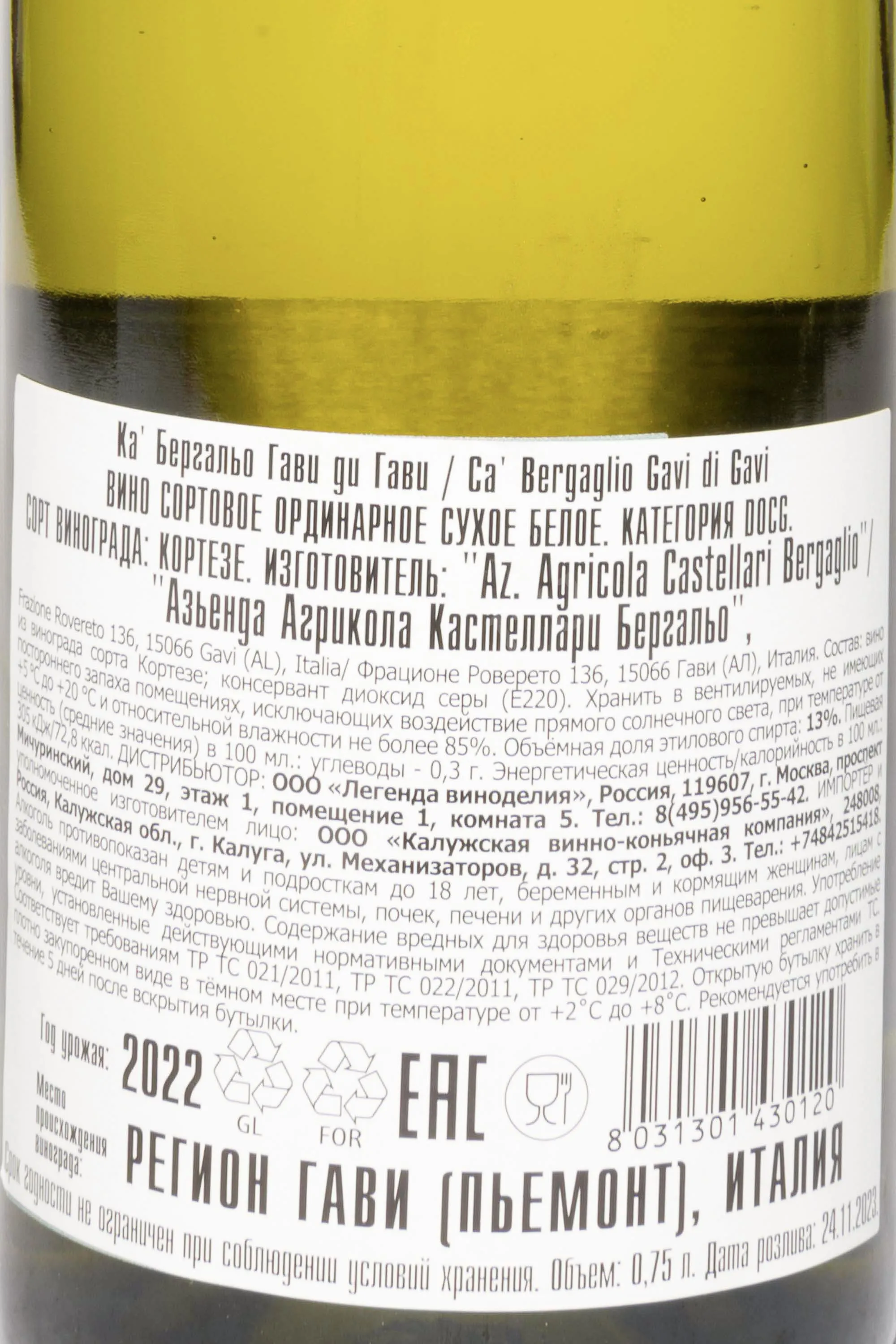 Castellari Bergaglio Gavi di Gavi DOCG 2022 0.75 л купить - Итальянское вино Ка Бергальо Гави ди Гави ДОКГ цена в магазине г. Москва, ул. Профсоюзная, д. 16/10 10:00-22:00 Ежедневно +7 (495) 920-20-02 info@cru.ru