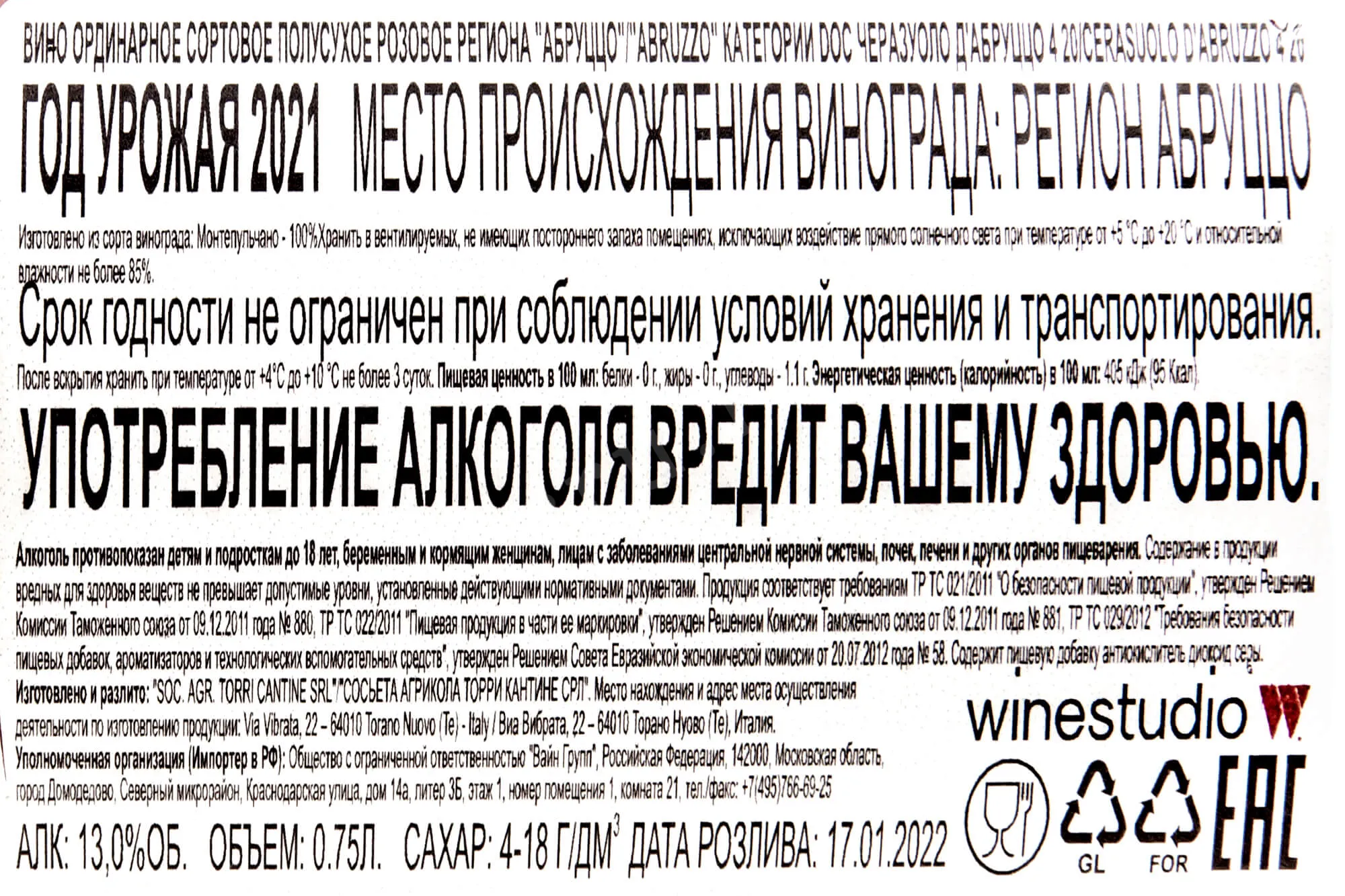 Вино Cerasuolo 4 20 d'Abruzzo 2021 0.75 л создано из тщательно отобранных ягод, выращенных на солнечных холмах региона Абруццо в центральной Италии. Урожай собирался вручную в утренние часы, затем ягоды быстро транспортировали на винодельню, где применялась особая методика кратковременного контакта сусла с кожицей, благодаря чему напиток приобрёл характерный насыщенный розовый оттенок. Процесс ферментации проходил при контролируемой температуре в стальных ёмкостях, сохранив свежесть и подчёркнутые фруктовые оттенки букета.