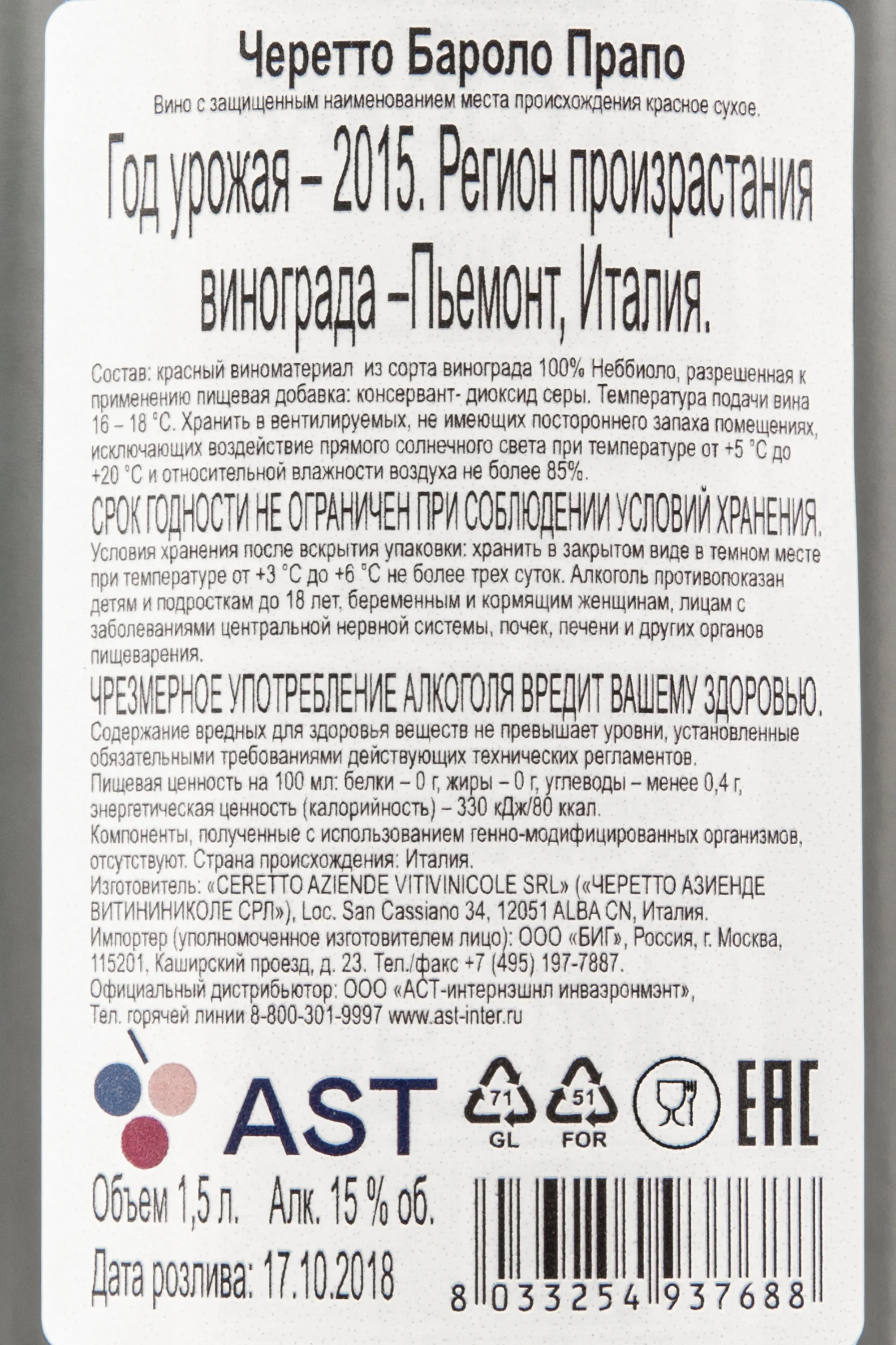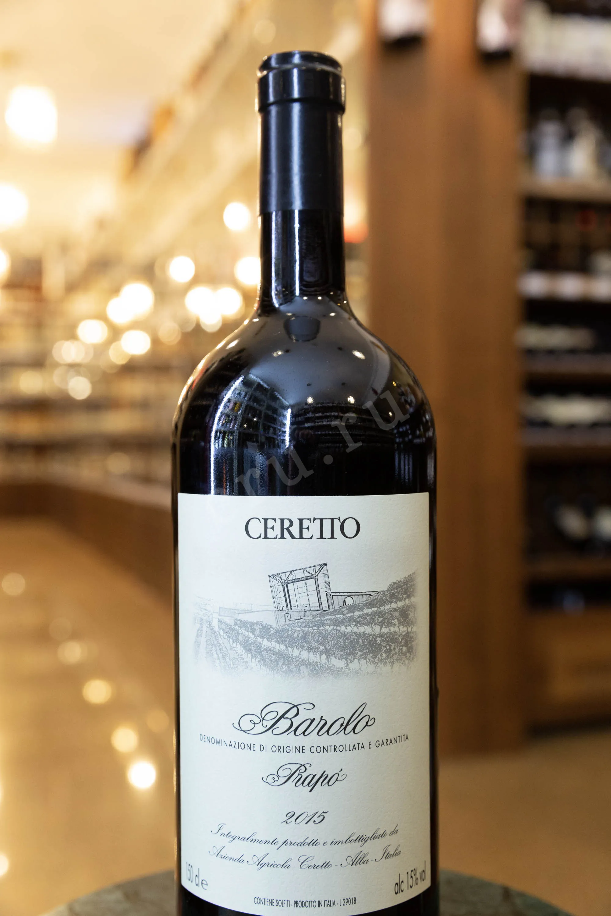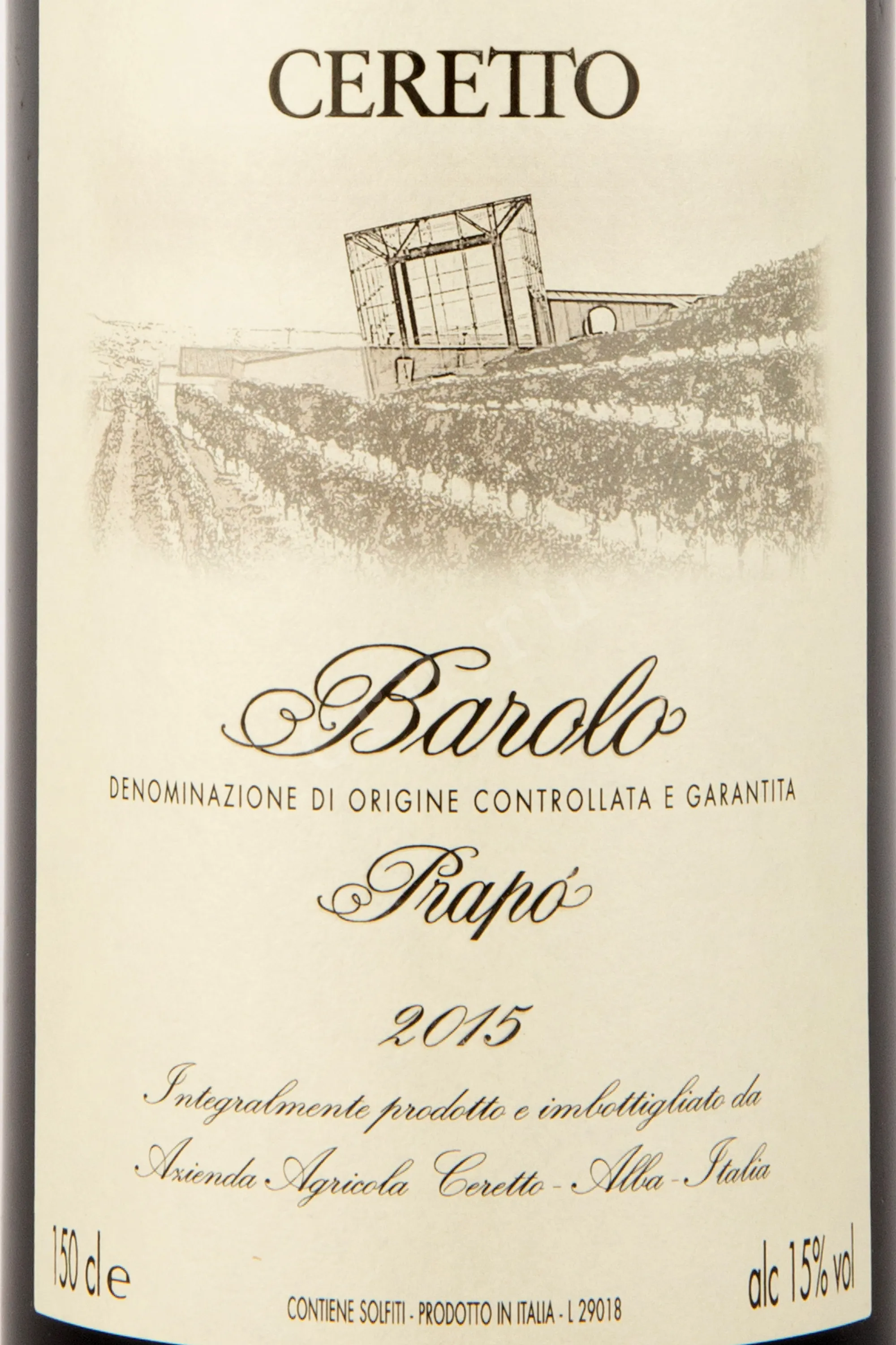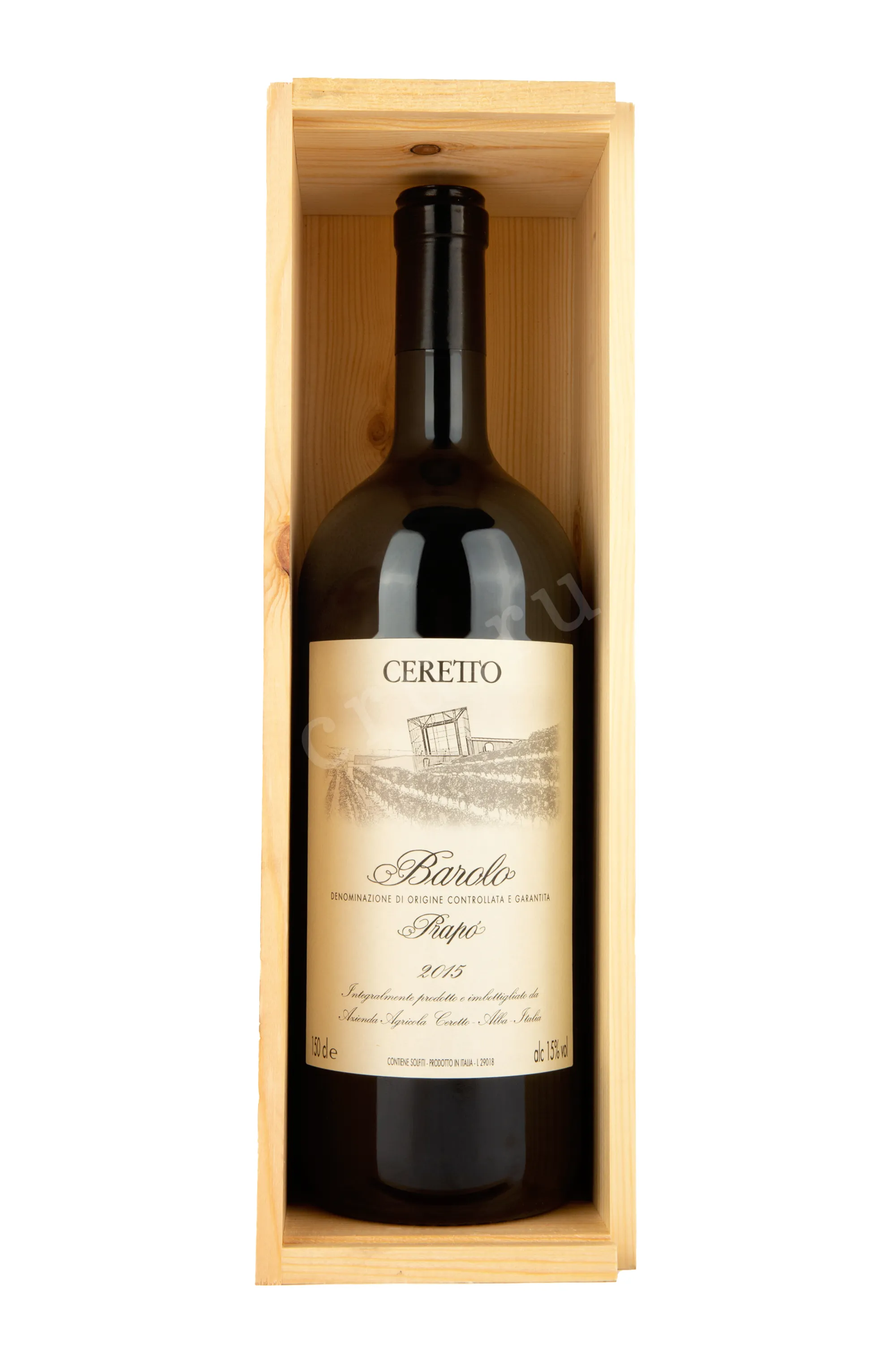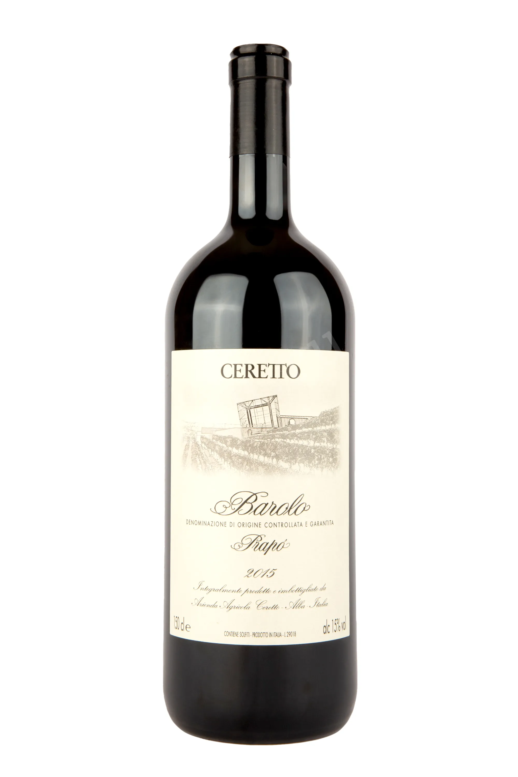 Красное сухое вино Ceretto Barolo Prapo DOCG 2015 г. 1,5 л доступно для приобретения в бутылке увеличенного формата, которая идет в комплекте с сувенирным деревянным боксом, украшенным логотипом выпускающей винодельни. Алкоголь защищенного географического наименования обладает 15-процентной крепостью и моносортовым составом из ягод автохтонного винограда удачного урожайного года, которые собрали на территории пьемонтской коммуны Серралунга-д`Альба. Вино создано по традиционной технологии с применением стадий сбраживания и вызревания в дубовых барриках. Его потенциал хранения составляет не менее 10 лет.