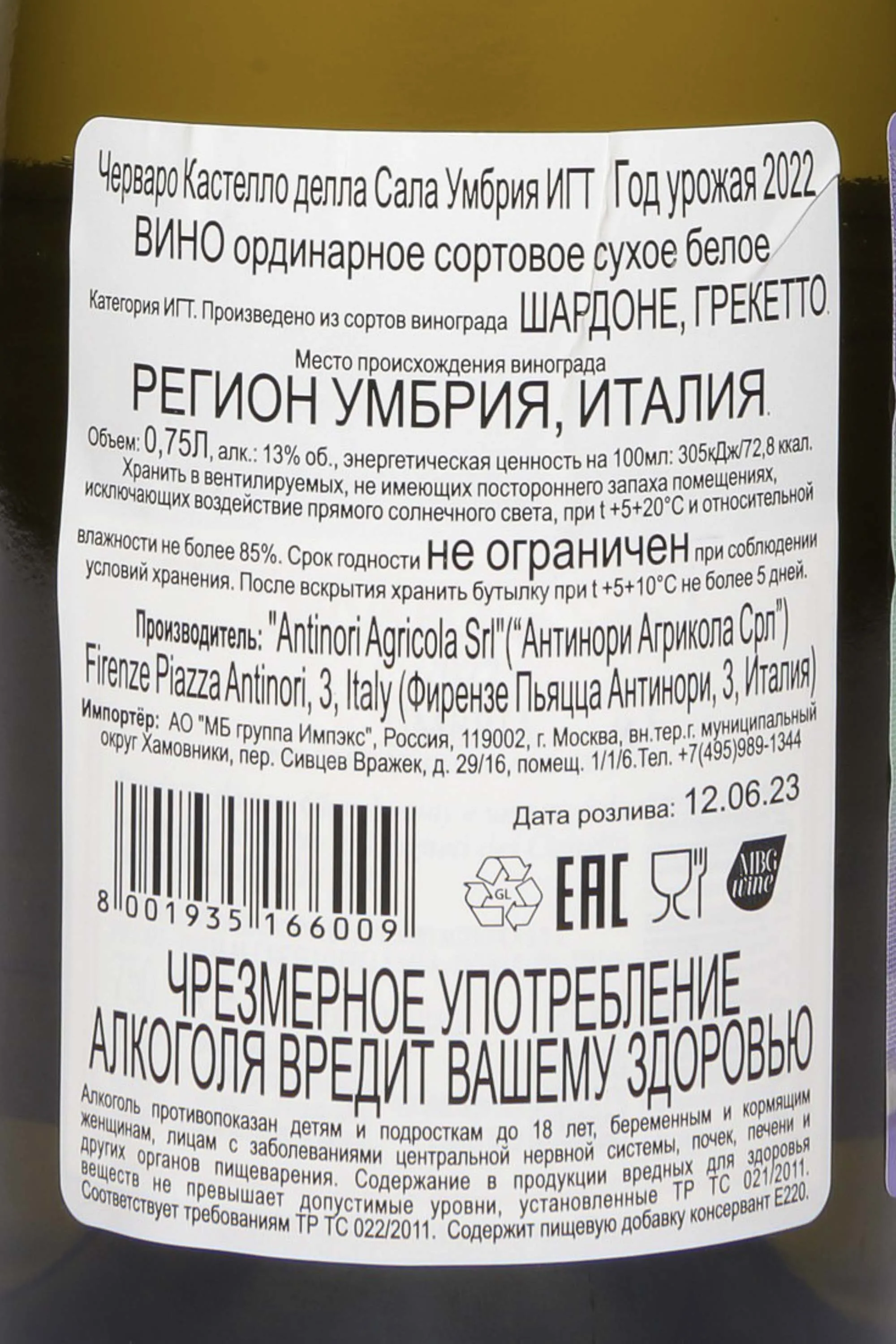 Белое сухое вино Cervaro Castello della Sala Umbria 2020 г. 0.75 л из итальянской области Умбрия представлено в ассортименте напитков знаменитой семейной компании, которая использовала для его создания два сорта винограда с участков региона Умбрия. Сбор урожая осуществился в течение ограниченного сезона. Ягоды сорвали с лоз рано утром и подвергли мацерации, ферментации и яблочно-молочному брожению при контроле температурных показателей, затем была проведена выдержка. Разлитое по бутылками вино крепостью 12,5% отправили на продажу после нескольких месяцев «отдыха» в погребах изготовителя.