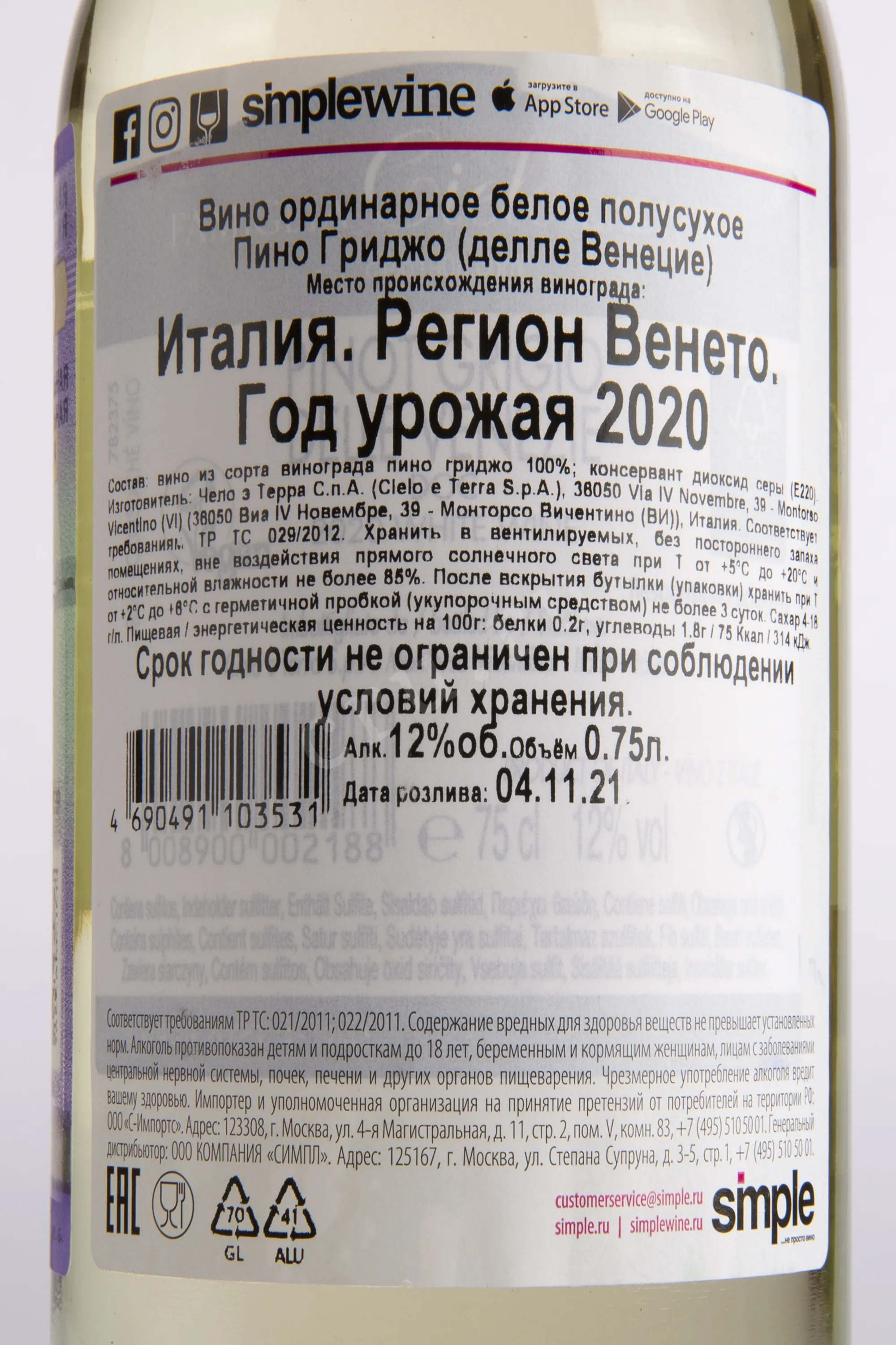 Вино Cielo e Terra Pinot Grigio 2020 г 0.75 l – это элегантный итальянский винтаж от одноименной компании, которая является одним из крупнейших производителей региона Венето. Собственные виноградники предприятия, общая площадь которых 300 гектаров, расположены на северо-востоке страны. Сырье для белого полусухого вино собирается довольно рано, чтобы сохранить его высокую кислотность. Виноград сбраживается отдельно от кожицы в чанах из нержавеющей стали, а после перегоняется и некоторое время хранится в нейтральных емкостях. Готовый 12-процентный напиток имеет потенциал хранения до 3-х лет.