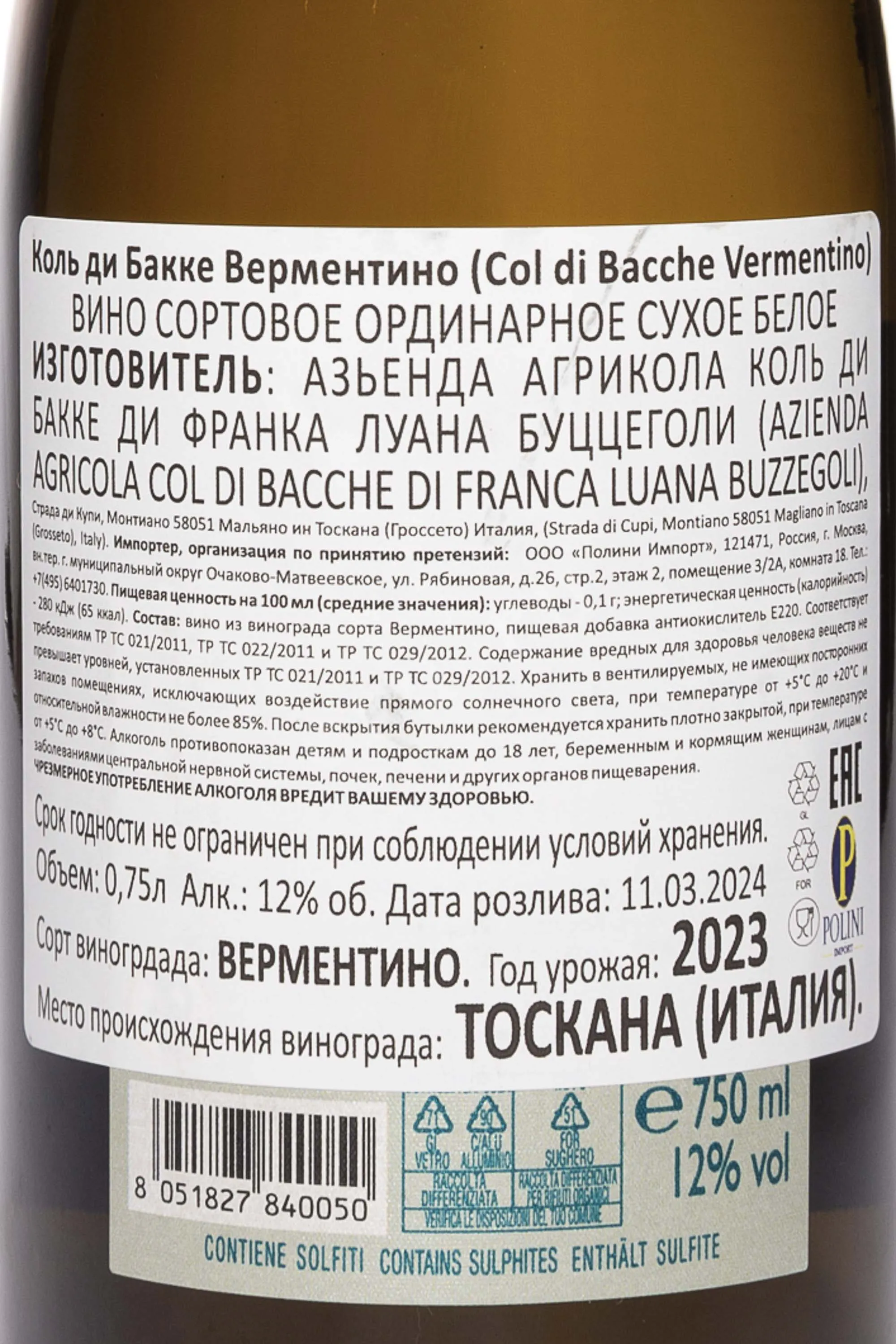 Col di Bacche Vermentino 2024 0.75 л купить - Итальянское вино Коль ди Бакке Верментино цена в магазине г. Москва, ул. Профсоюзная, д. 16/10 10:00-22:00 Ежедневно +7 (495) 920-20-02 info@cru.ru