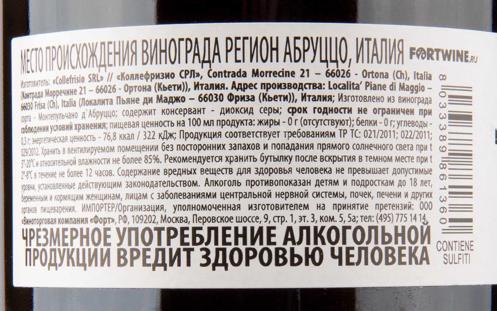 Вино Collefrisio Montepulciano d'Abruzzo DOC 0.75 л — красное сухое органическое итальянское вино. Сбор урожая осуществляется в середине октября. Мацерация на мезге длится 15-20 дней. Ферментация производится в терморегулируемых резервуарах из нержавеющей стали.