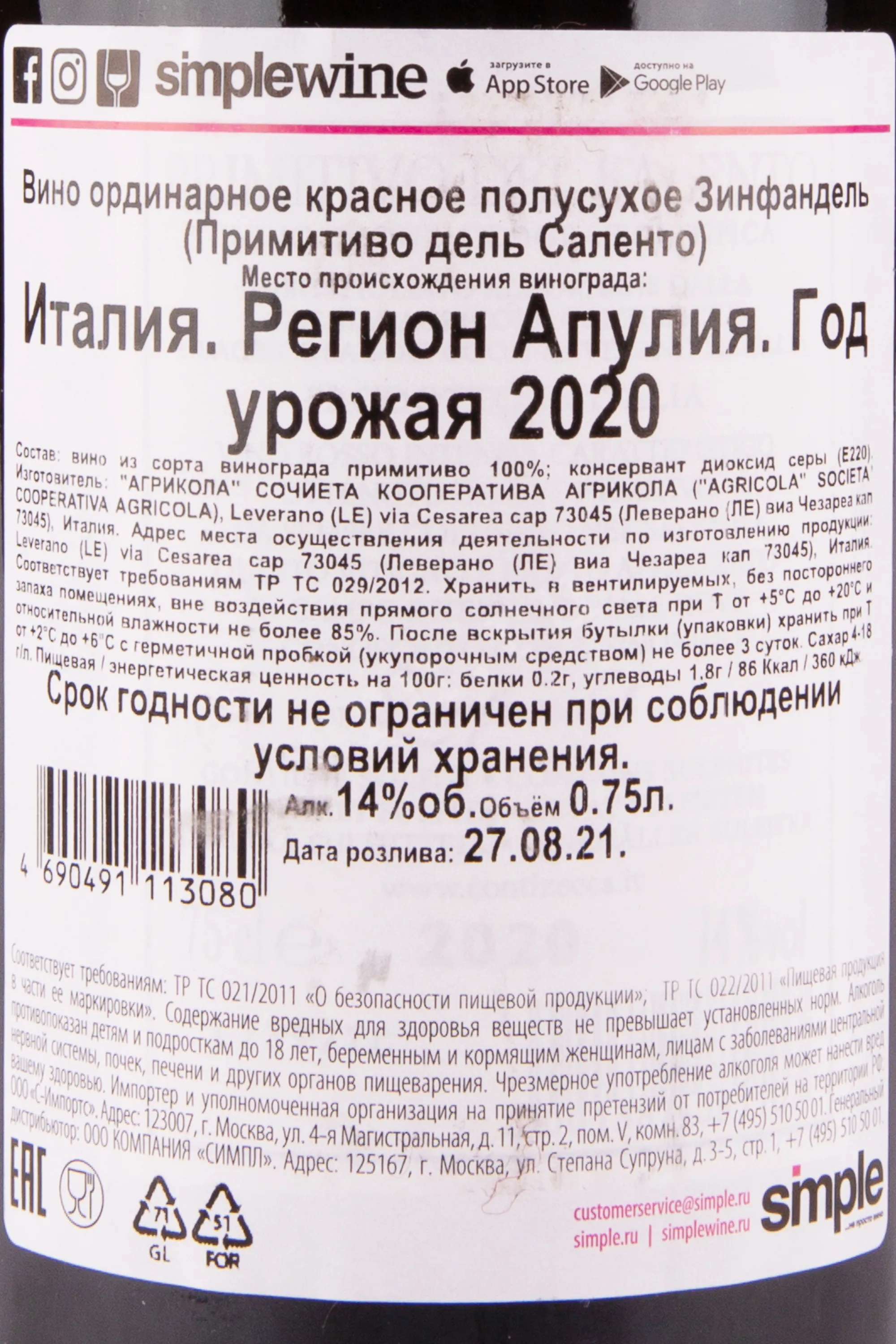 • Сорт винограда: Примитиво (100%).