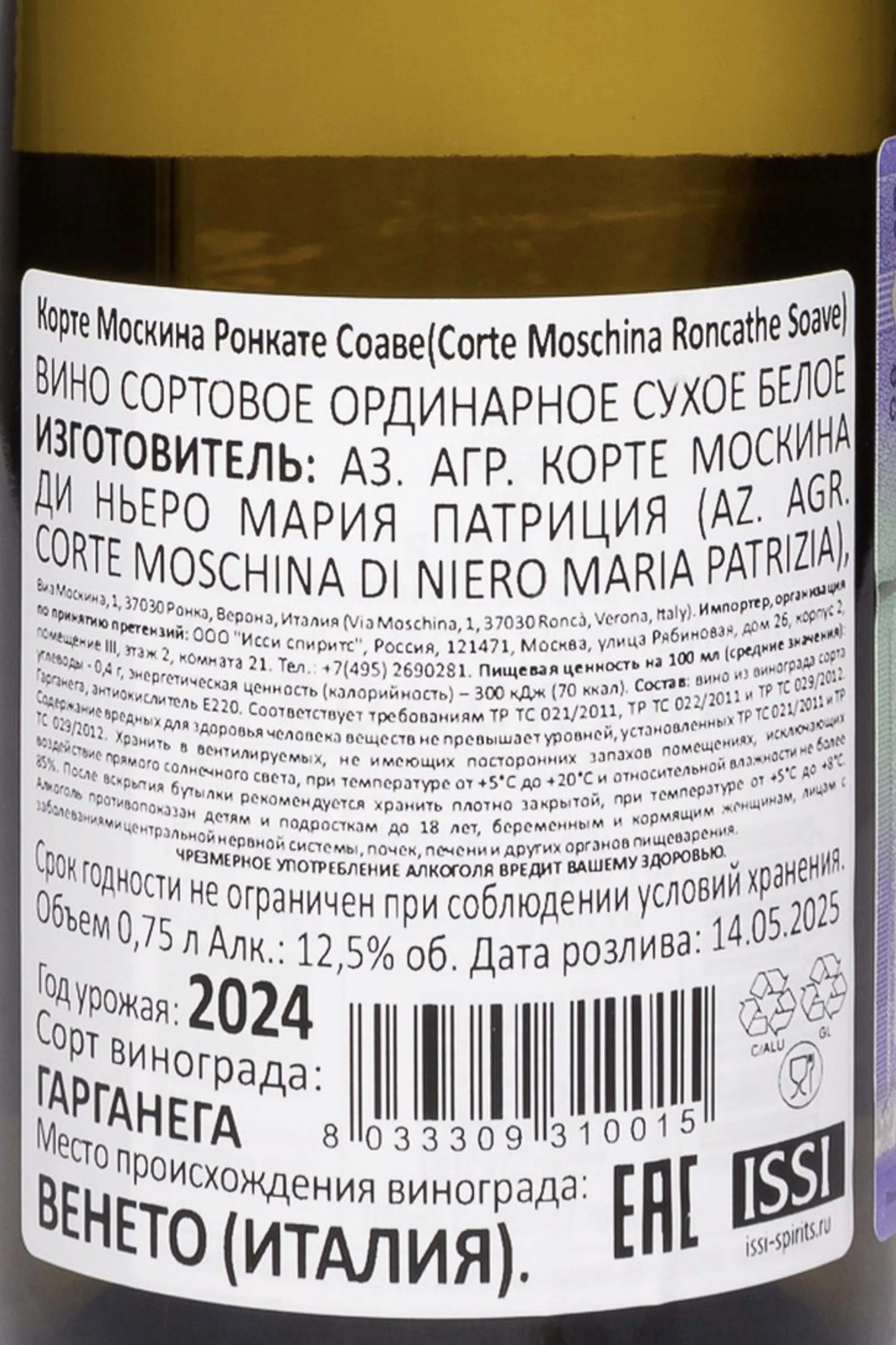 Белое сухое вино Corte Moschina Roncathe Soave 2024 года 0,75 л создано в классическом стиле региона Венето. Оно воплощает свежесть и элегантность терруара Соаве, где виноградники расположены на холмах возле деревни Ронка. Почвы здесь вулканического происхождения, с высоким содержанием базальта, что придаёт ягодам минеральный характер. Урожай 2024 года оказался удачным: умеренно тёплая весна и сухое, но не жаркое лето позволили винограду созреть равномерно, сохранив кислотность и аромат. Сорт Гарганега собирали вручную в конце сентября. После короткой холодной мацерации сусло проходило медленную ферментацию при низкой температуре (около 13 °C), что сохранило свежие фруктовые ноты. Выдержка на тонком осадке в стальных резервуарах длилась около пяти месяцев. Итог — гармоничное, сбалансированное вино с чистым вкусом и узнаваемой минеральностью, характерной для зоны Соаве.