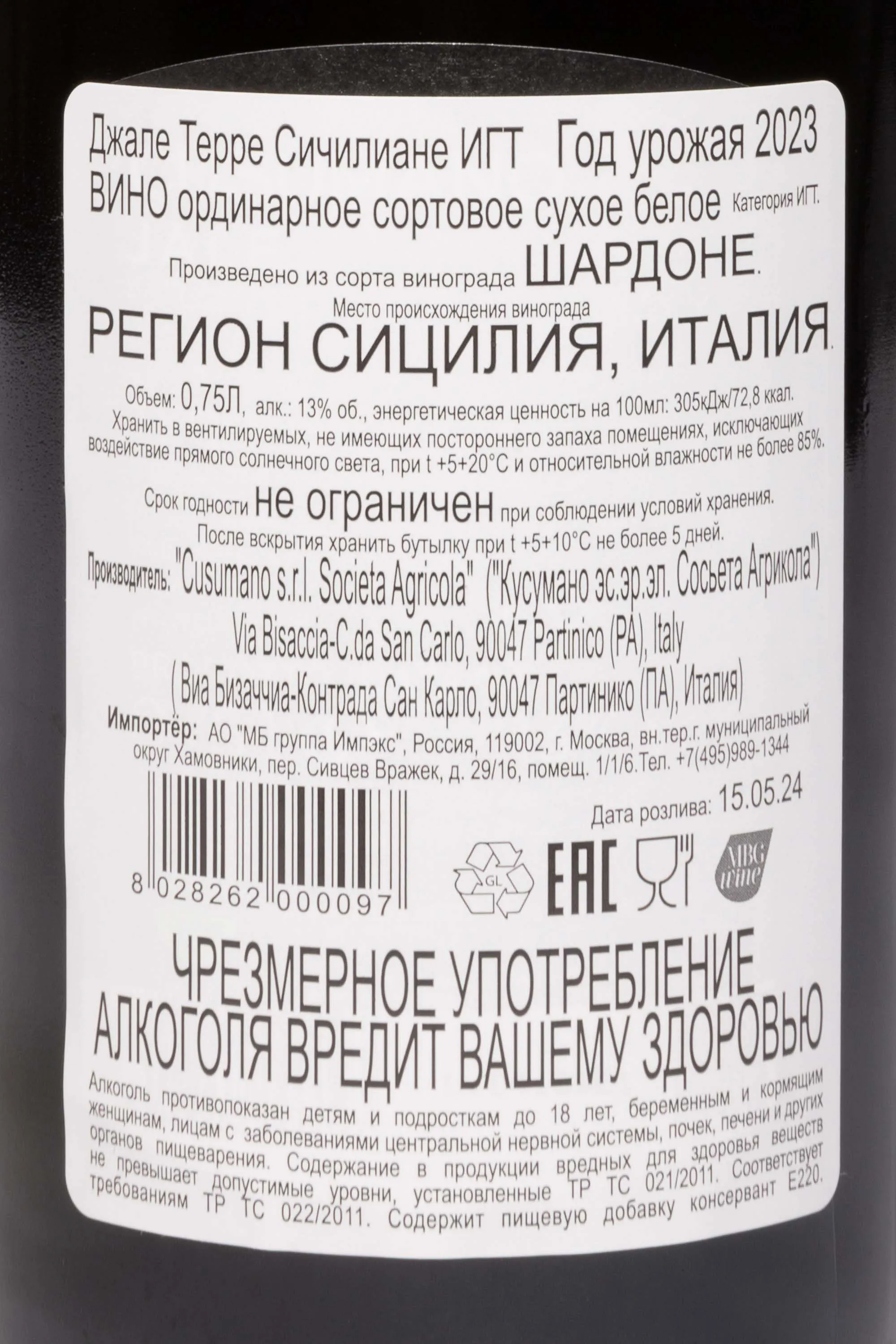Белое сухое вино Cusumano Jale Sicilia DOC 2023 г. 0,75 л изготовили в Италии на базе европейского сорта винограда с плантаций высотой 700 м над уровнем моря. Ягоды собрали в течение одного года урожая и отправили на сортировку, после чего поместили в 225-литровые дубовые бочонки для мацерации, ферментации и выдержки сроком полгода. Эксперты советуют продегустировать это вино не позднее, чем через пять лет после бутилирования.