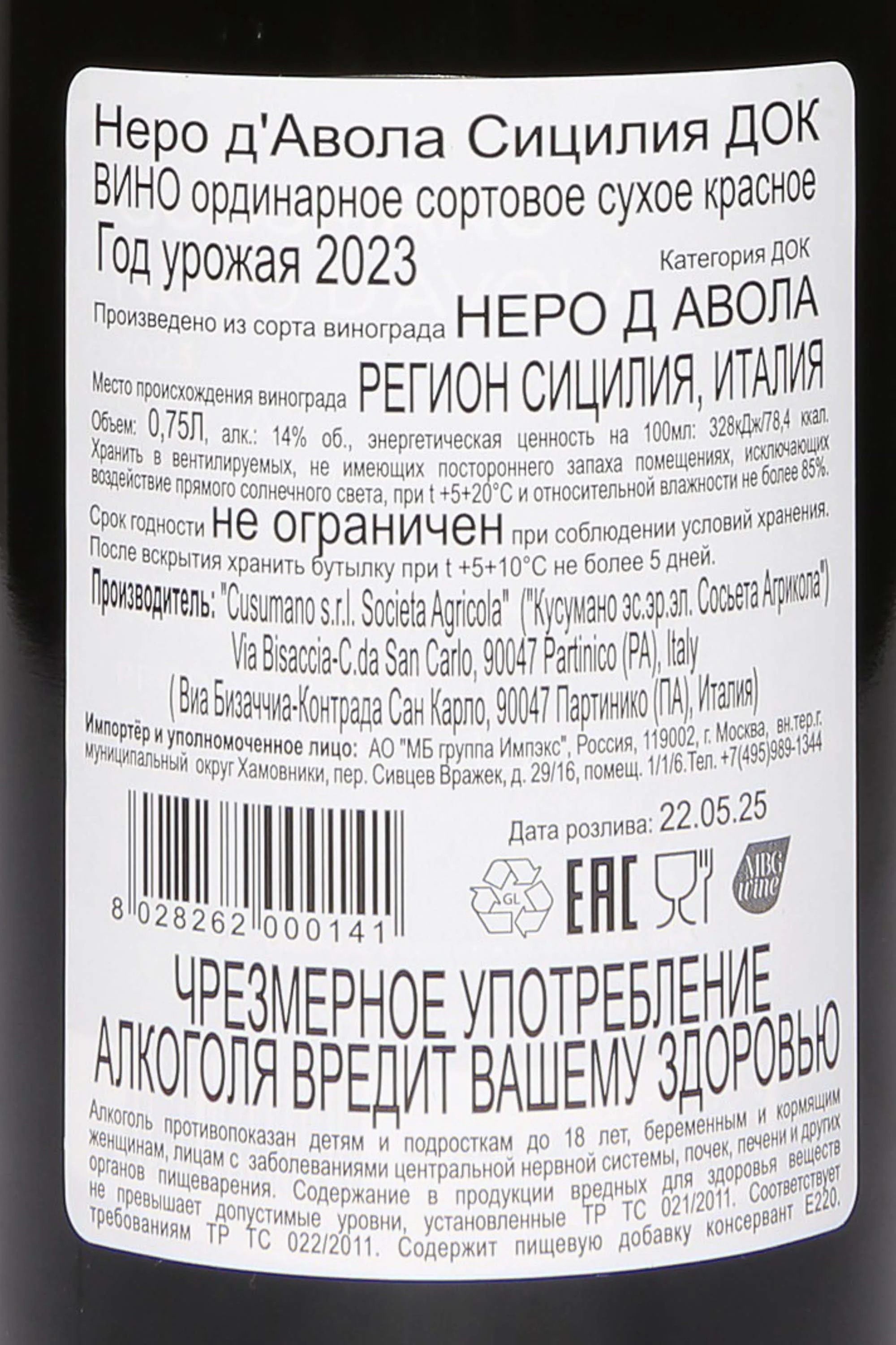 Красное сухое вино Cusumano Nero D'Avola Terre Siciliane 2023 г. 0,75 л отражает характер одного из самых узнаваемых сортов Сицилии. Виноградники расположены в центральной и южной части острова, где почвы состоят из известняков, вулканических туфов и песчаных отложений. Климат здесь типично средиземноморский: мягкая зима, продолжительное лето и постоянные морские бризы. Урожай созрел в условиях теплой весны и жаркого, но не засушливого лета. Ночи оставались прохладными, что позволило ягодам сохранить кислотность при высокой степени зрелости. Сбор проводился вручную, с последующей ферментацией при контролируемой температуре в стальных емкостях. Такой метод позволяет максимально раскрыть сортовой потенциал и сохранить свежесть.
