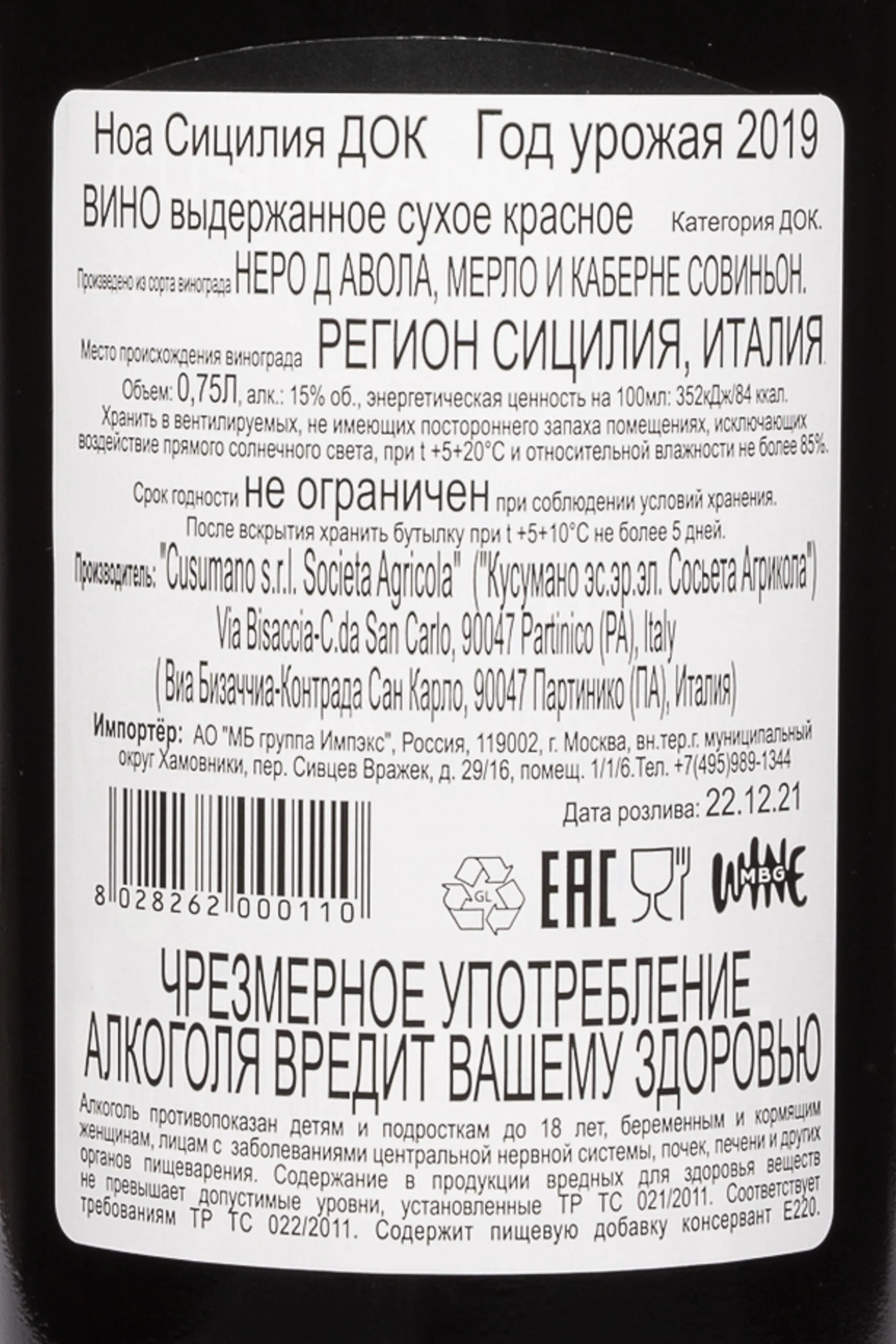 Вино Cusumano Noa Sicilia DOC 2016 г. 0,75 л — флагманский напиток итальянской винодельни, который объединяет в составе три сорта винограда с сицилийских угодий высотой порядка 250 м над уровнем моря. Сырье собрали в течение одного года с глинистых участков юго-восточной и южной экспозиции, где произрастают лозы средним возрастом 13 лет. Окисление сусла прошло при строгом термоконтроле, также для ферментации применялись маленькие бочки. Выдержка вина в дубе продлилась 12 месяцев. Дополнительный «отдых» в бутылках позволил сделать вкусоароматику богатой и сбалансированной. Это спиртное рекомендуется употребить в течение 7-10 лет после розлива, проведенного в июле 2018 года. За час до употребления напиток рекомендуется декантировать.