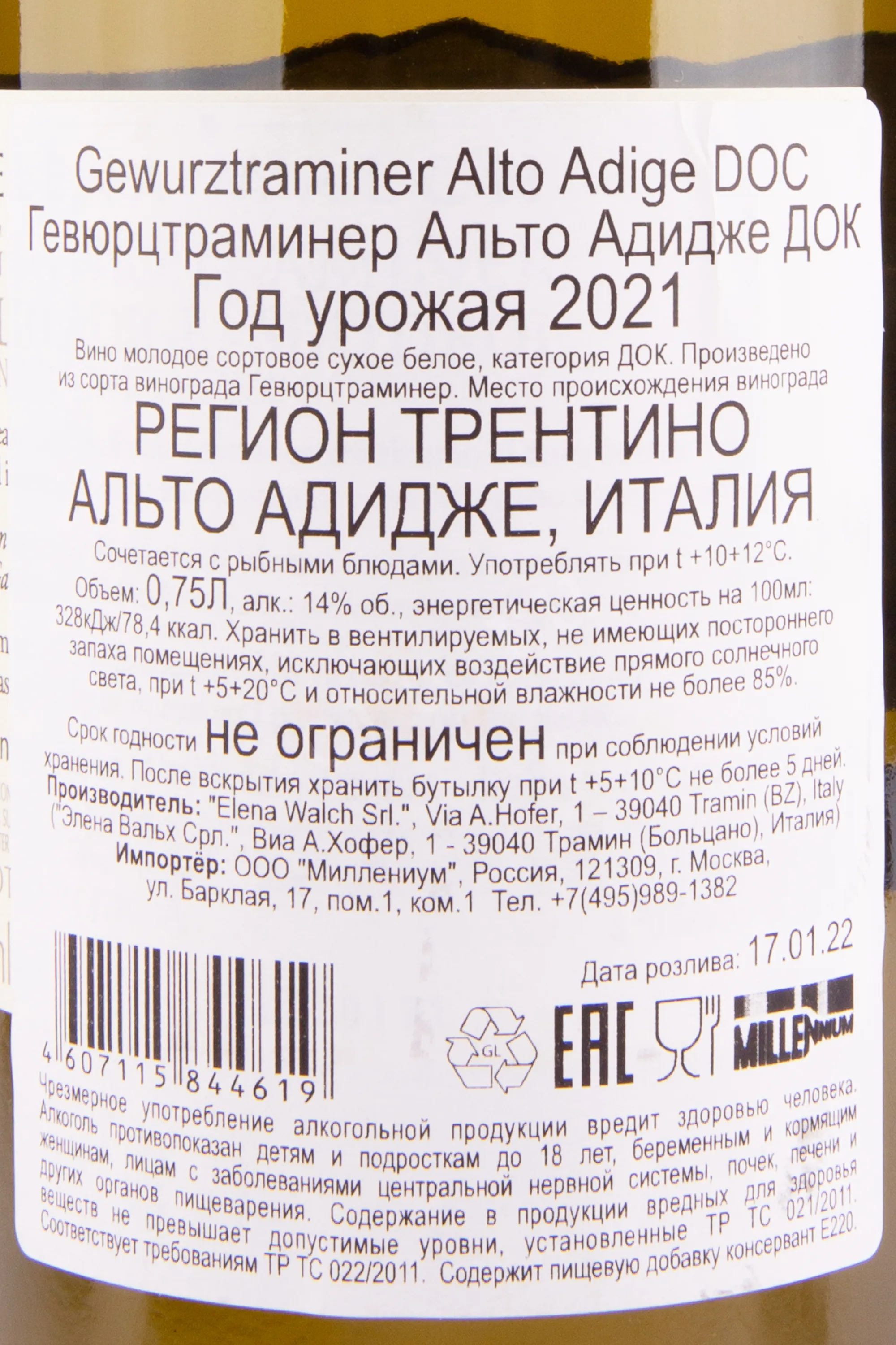 Белое сухое вино Elena Walch Gewurztraminer Alto Adige 2022 г. 0,75 л — качественный терруарный напиток с многогранным вкусоароматом, отражающим самобытные свойства климата и почв Южного Тироля. Его выпустила итальянская компания под руководством Елены Вальх, которая руководствовалась технологиями непродолжительной мацерации на кожице, ферментации и выдержки в нейтральных стальных емкостях. Развитие вкуса вина в бутылке предполагается на протяжении 6 лет.