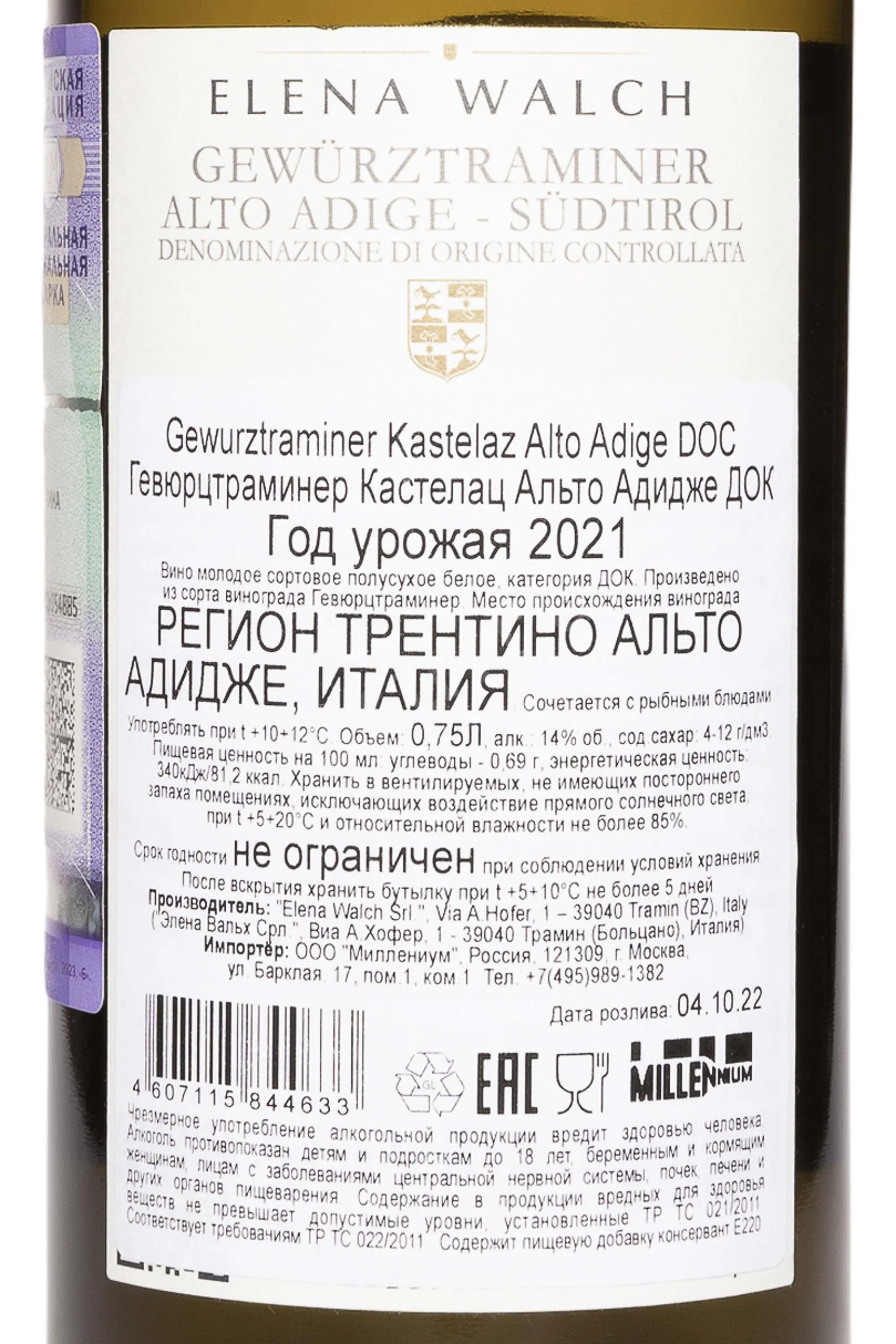 Белое полусухое вино Elena Walch Gewurztraminer Kastelaz Alto Adige DOC 2020 г. 0,75 л объединяет в составе спелый виноград одного сорта (в названии напитка обозначено его наименование), собранный в определенный сезон на просторах винодельческой области Италии Трентино-Альто-Адидже. После шестичасовой мацерации на кожице сусло прошло аккуратный отжим и сбраживание в металлической таре при 18 °C. До розлива 14-градусное вино недолгое время (не более нескольких месяцев) выдерживалось в стальных баках. Потенциал хранения напитка предположительно составляет 6 лет.