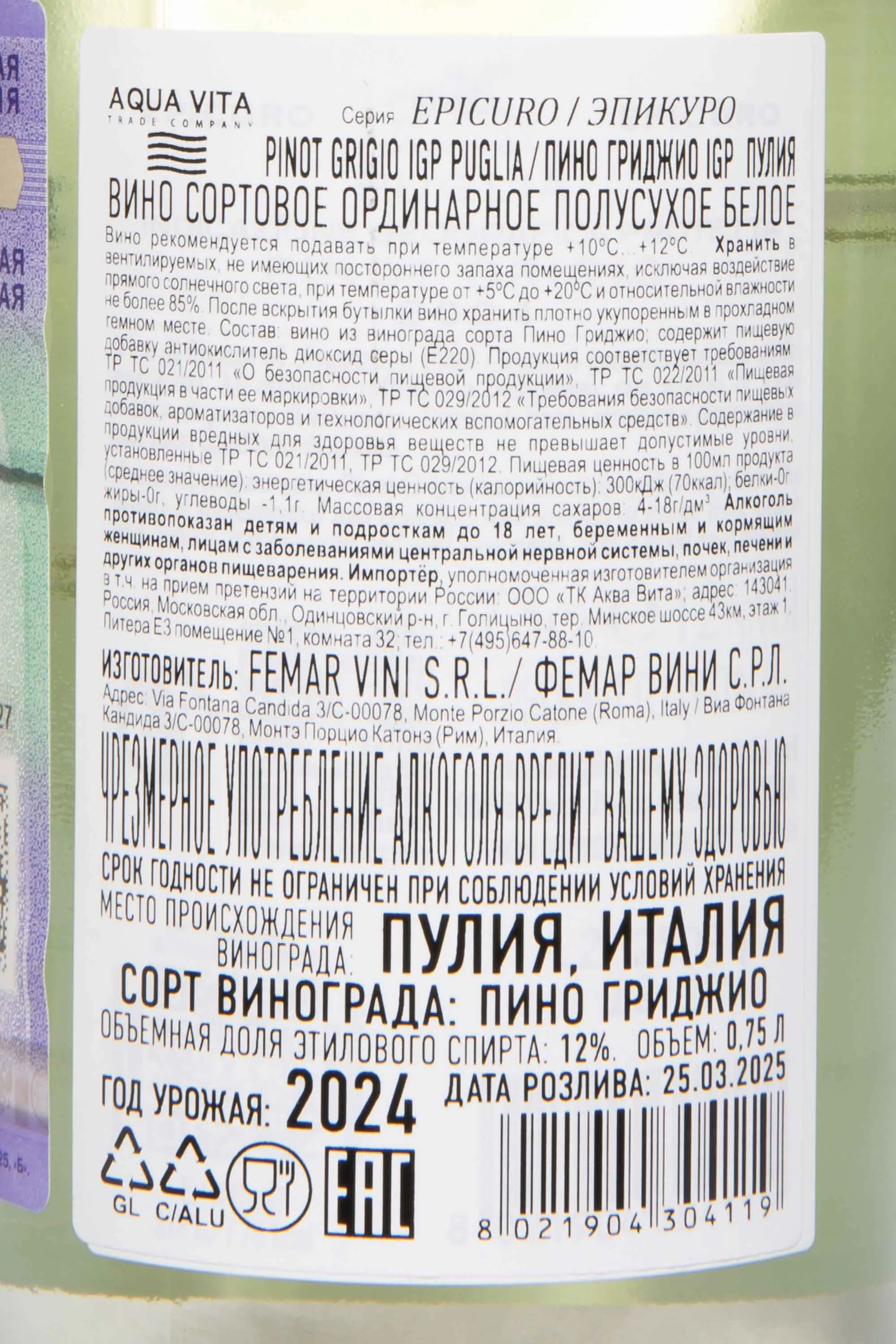 Эпикуро Пино Гриджио Пулия ИГП 2024 0.75
