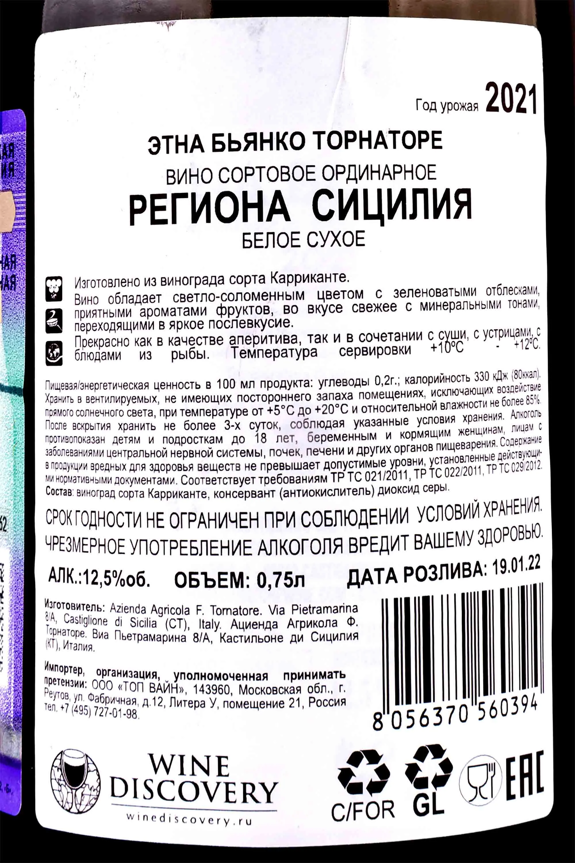 Вино Tornatore Etna Bianco 2022 0.75 л создано на живописных склонах вулкана Этна на острове Сицилия, где виноградники располагались на высоте около 650 метров. Урожай собирали исключительно вручную, чтобы сохранить целостность ягод, затем применили технологию холодной ферментации в стальных резервуарах, подчеркнув характерные минеральные и цитрусовые оттенки напитка. Особенностью производства стало бережное сохранение свежести и выраженной кислотности, характерных для вулканического терруара.